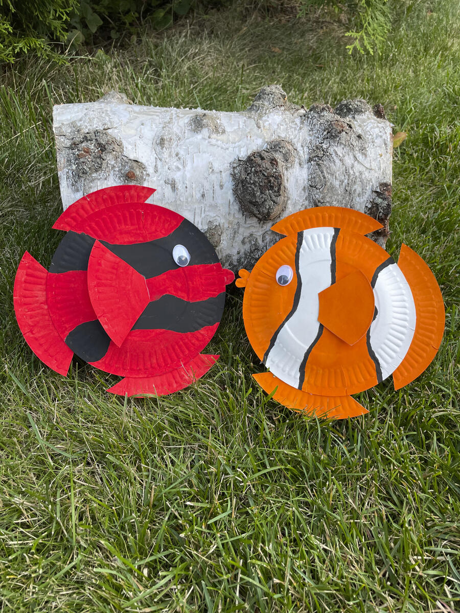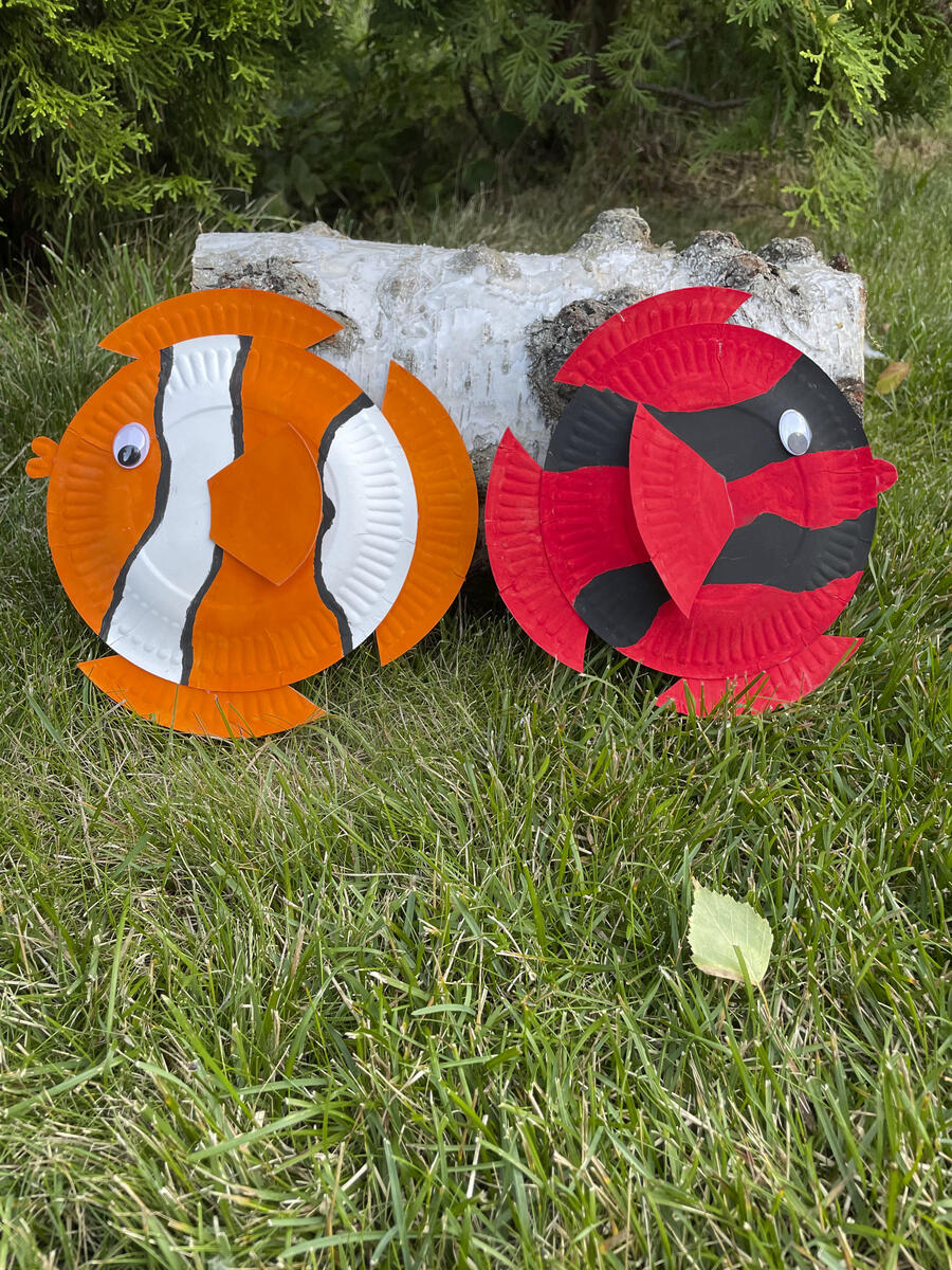 - Ta en papptallrik till och måla med röda o svarta ränder, eller orangea och vita ränder beroende på vilken fisk du vill göra. Låt torka.