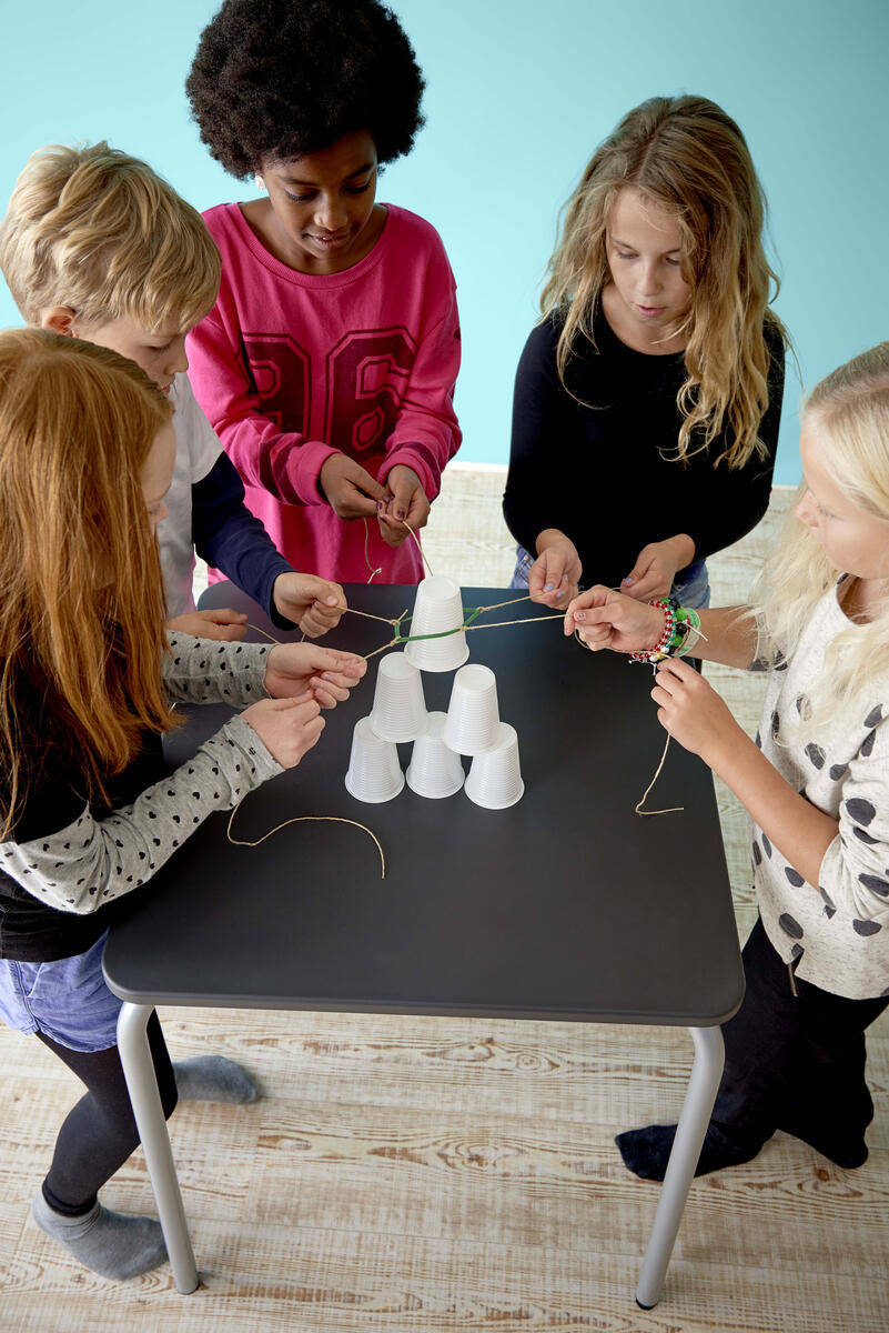 Uppdraget är nu att bygga en pyramid av sex pappmuggar, uteslutande med hjälp av gummibandet.