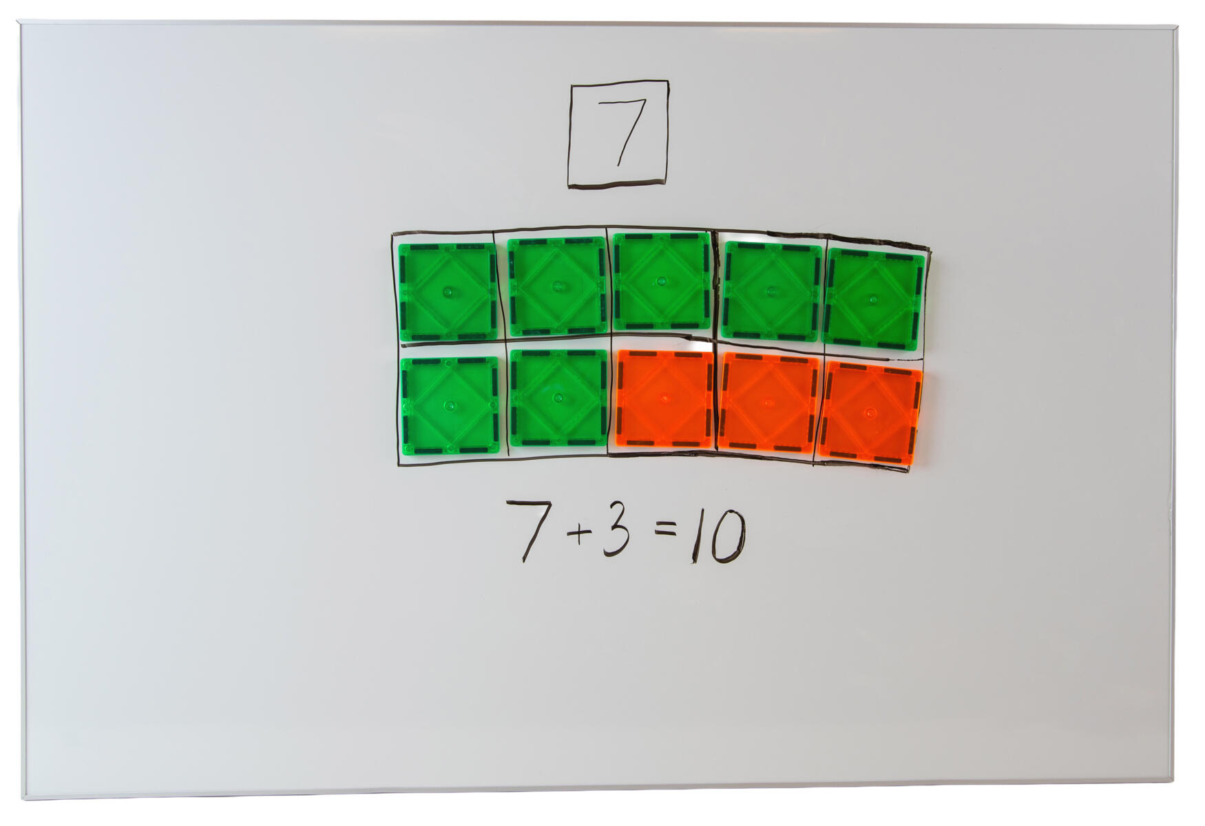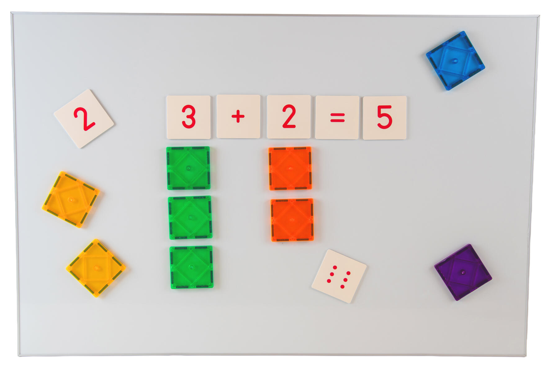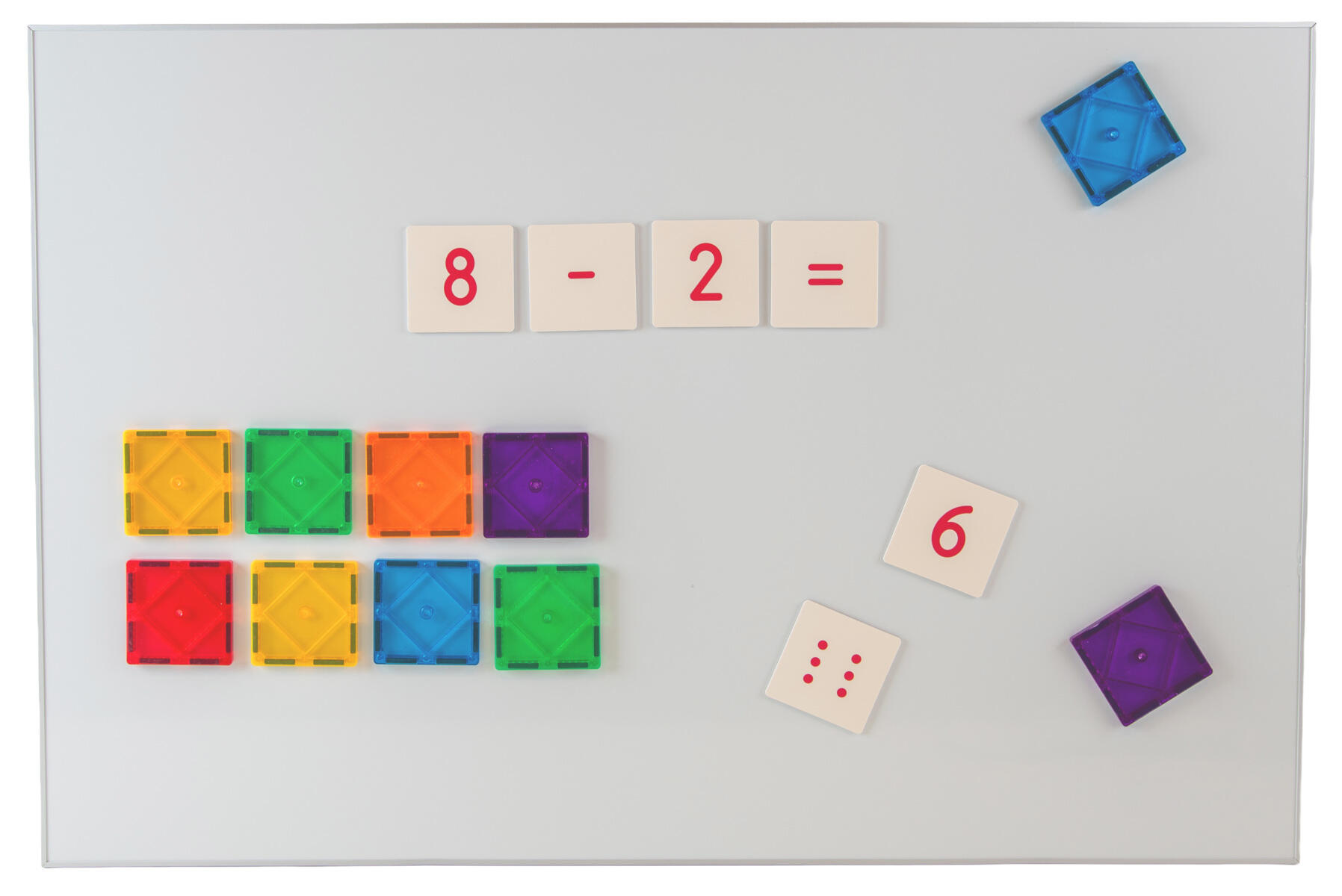 Använd Mag Genius siffror och magnetiska brickor tillsammans med en whiteboardtavla eller annan magnetisk yta. Siffrorna fäster på den magnetiska ytan och tillsammans med brickorna kan man skapa konkreta och lärorika aktiviteter där barnen tränar på bl.a. addition, subtraktion och likhetstecknets betydelse. Låt barnen vara med och sätta upp brickor, siffror och tecken.