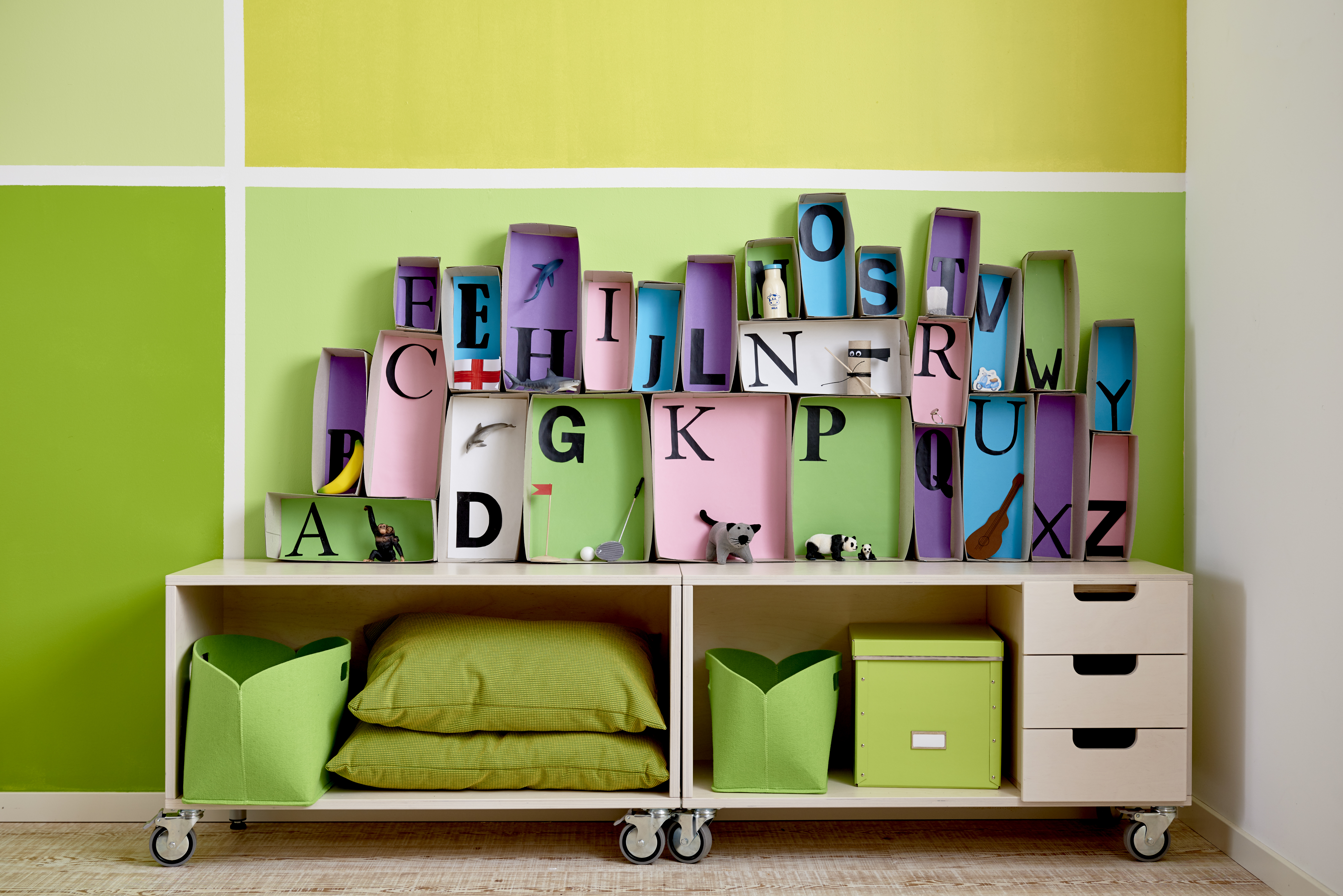 Försök nu hitta saker som börjar på bokstaven som står i lådan och låt dem flytta in.