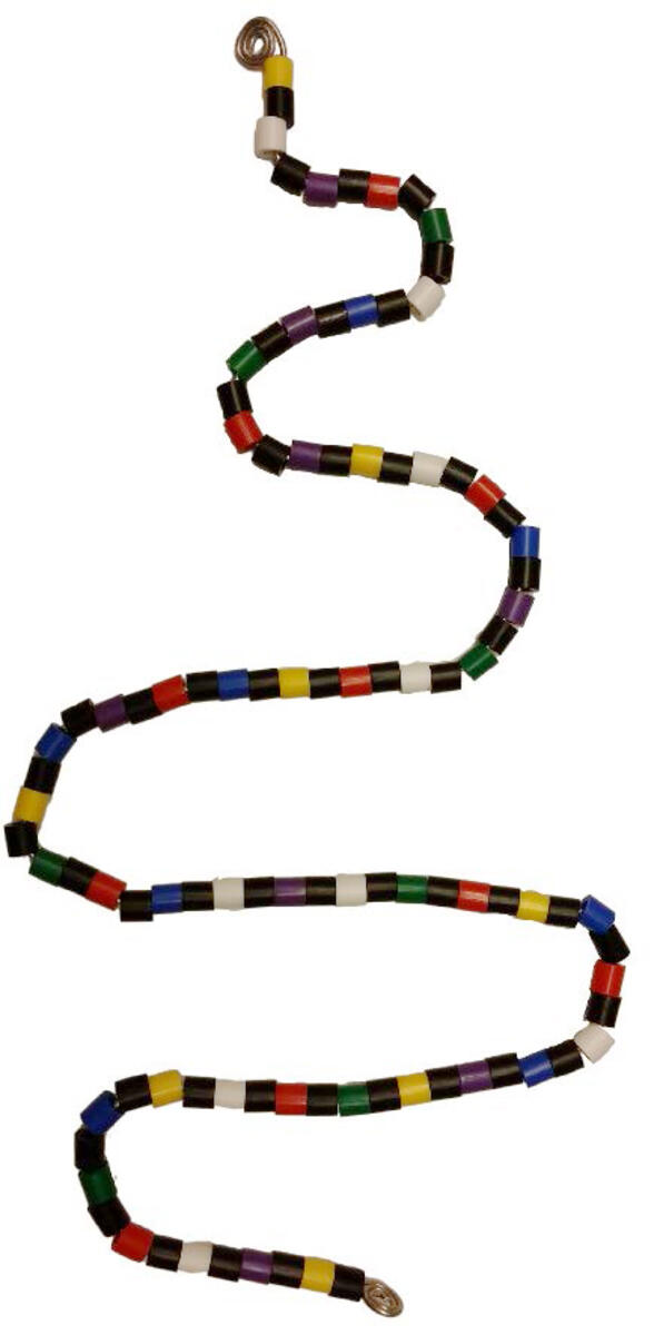 - Trå på 100 st pärlor, varje pärla är 1 cm lång.