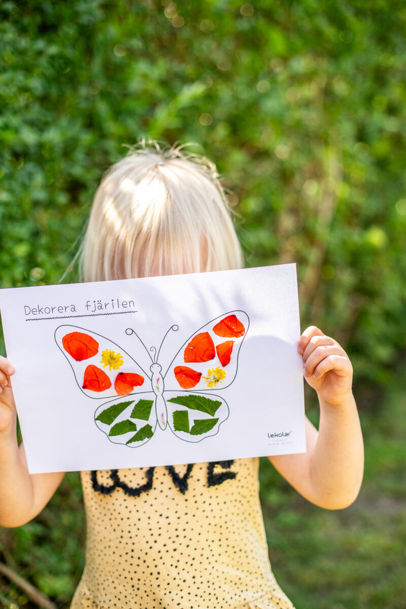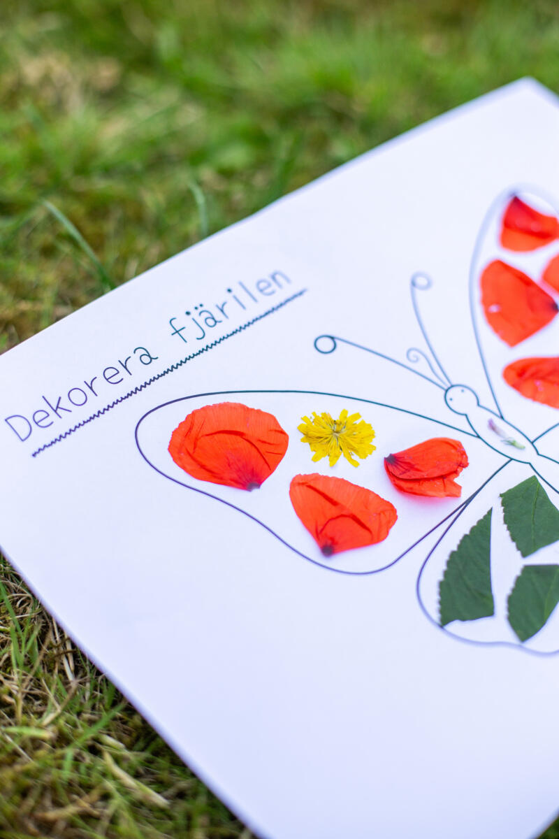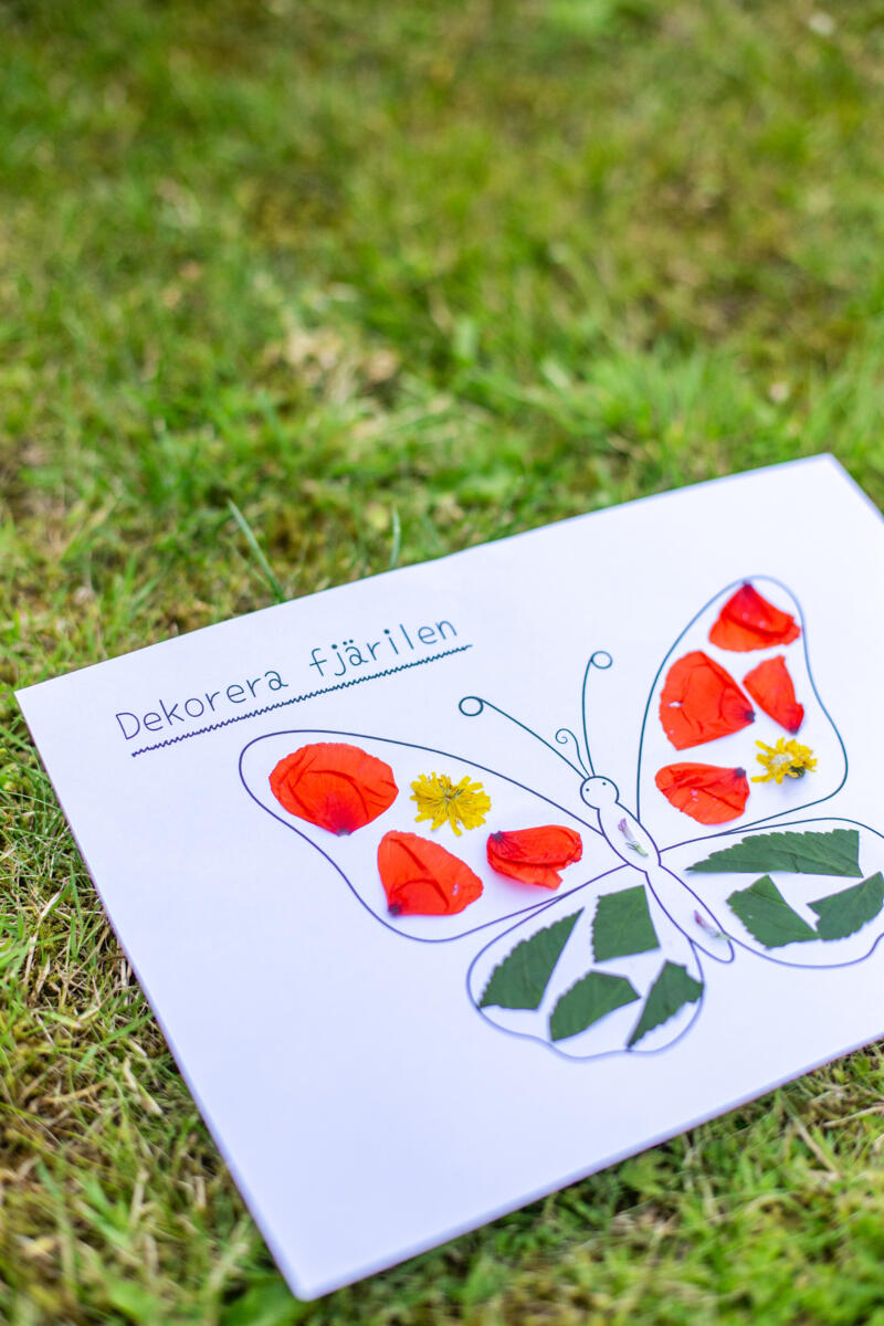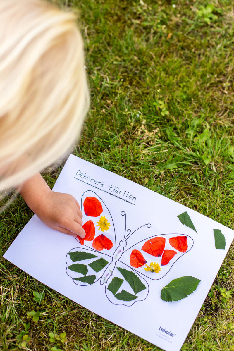- Lägg ut naturmaterialet som dekoration på fjärilen, limma fast om ni vill.