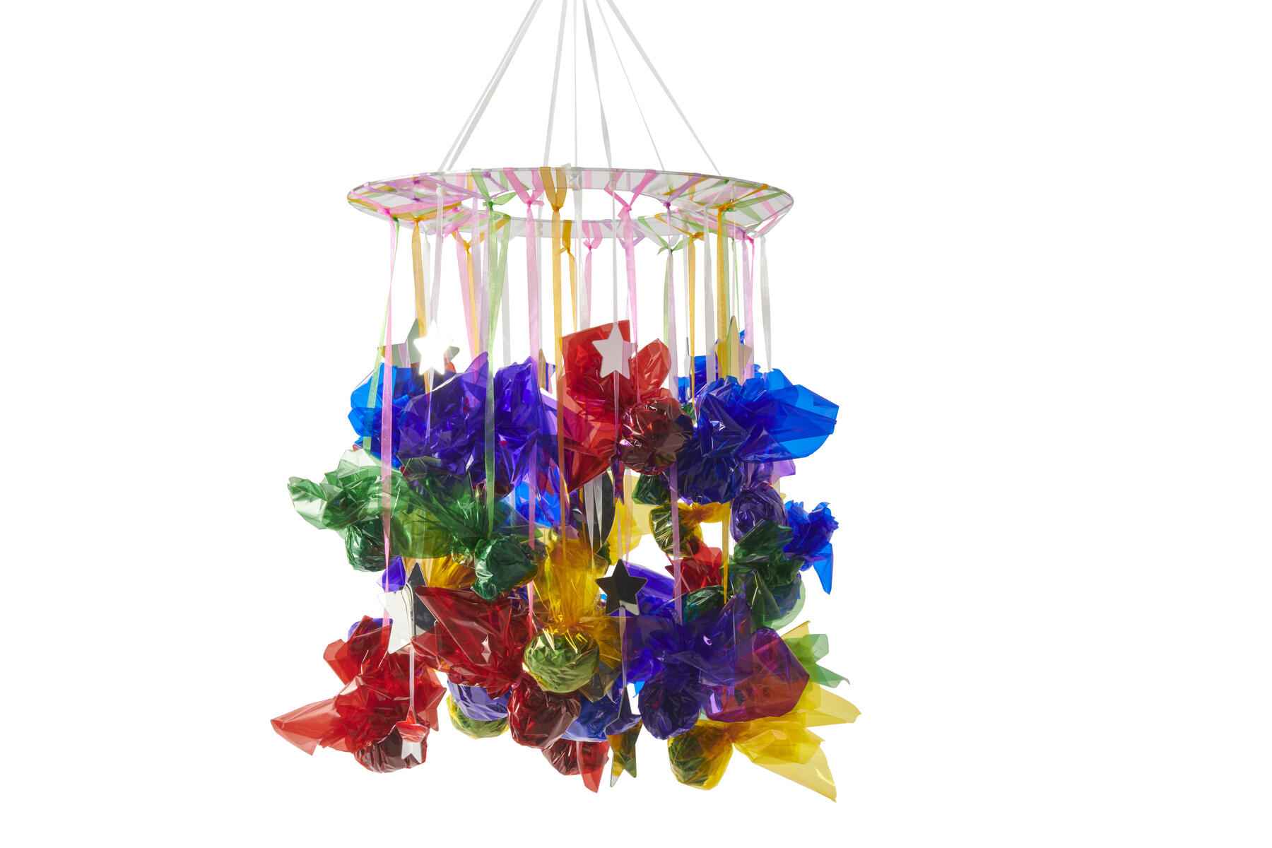- Klipp banden i olika längder och knyt sedan fast dessa på t.ex. en pinne eller båge och låt hänga i olika längder.