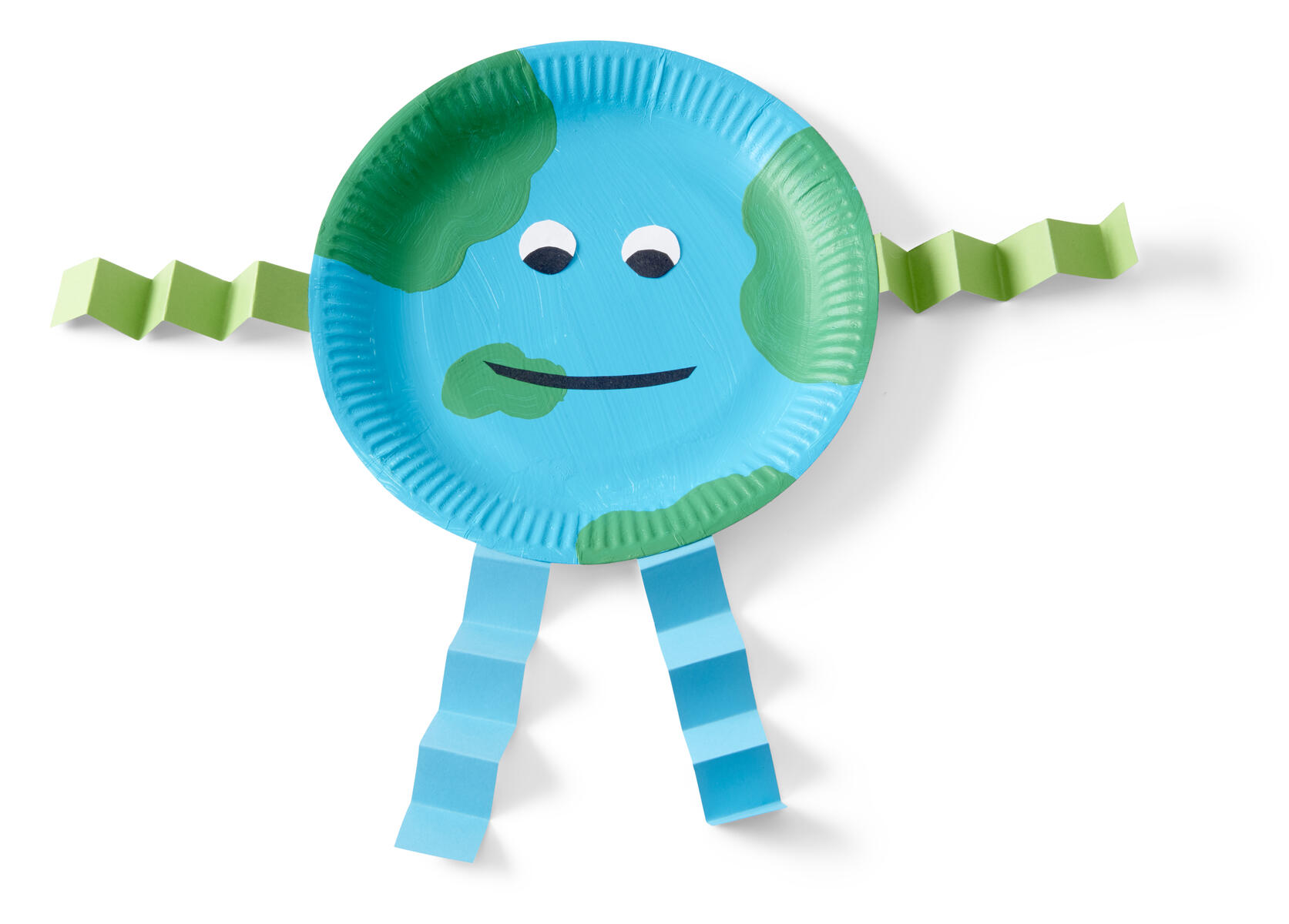 - Klipp ut ben och armar i blått och grönt papper. Vik varje remsa så att den får ett vågigt utseende. Limma fast på baksidan av papptallriken.