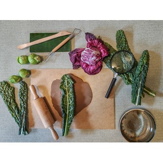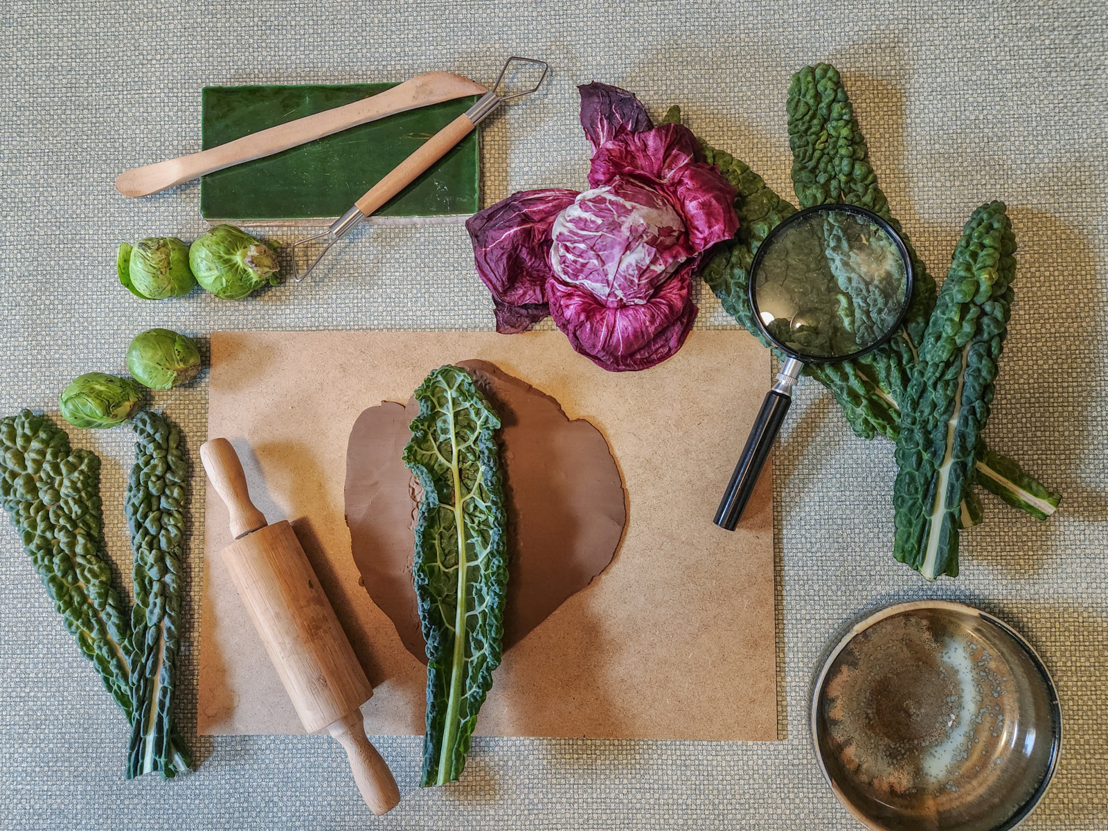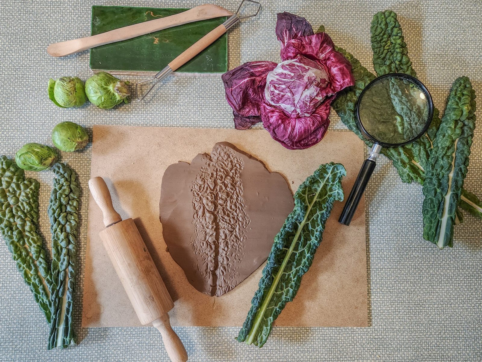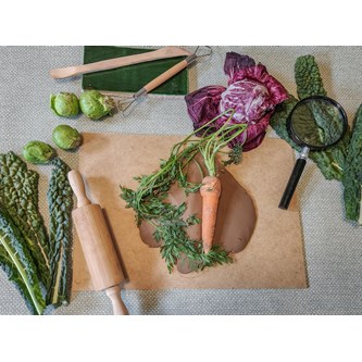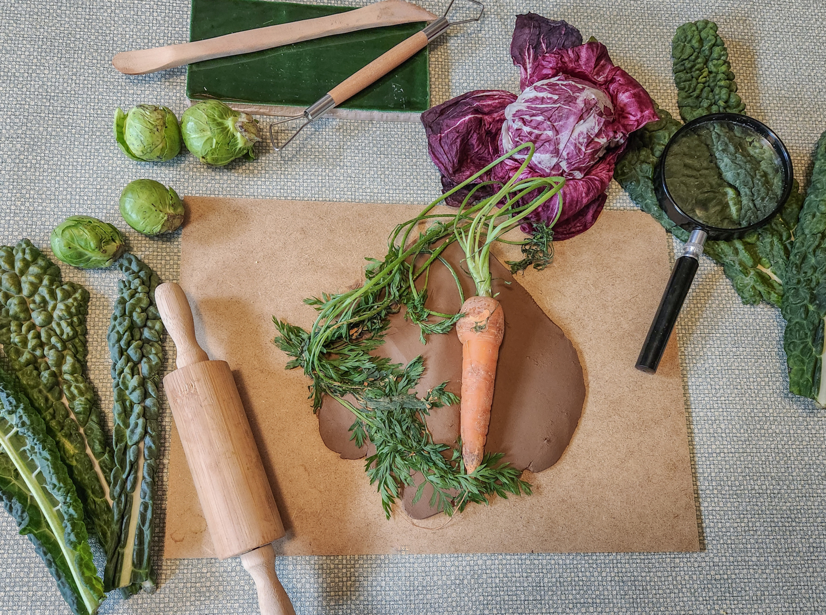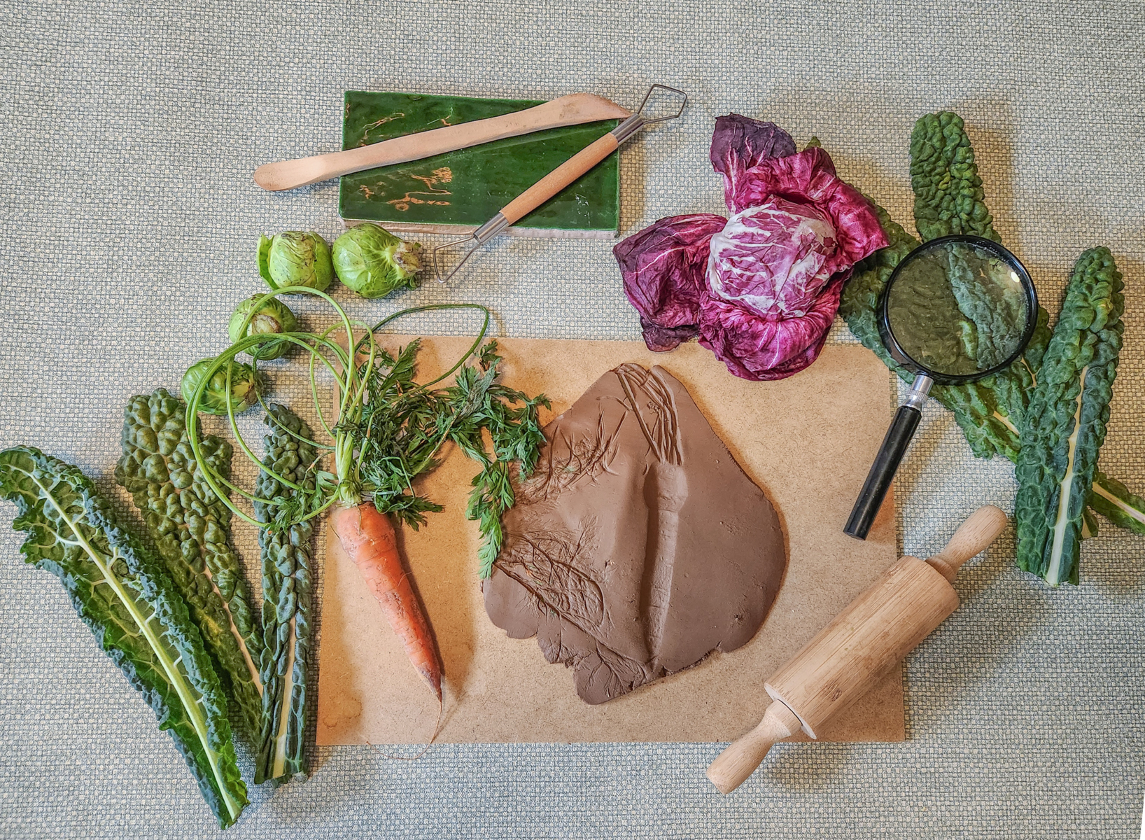 - Duka upp olika grönsaker t.ex. morötter, grönkål, brysselkål och broccoli som man kan använda för att trycka mönster i leran.