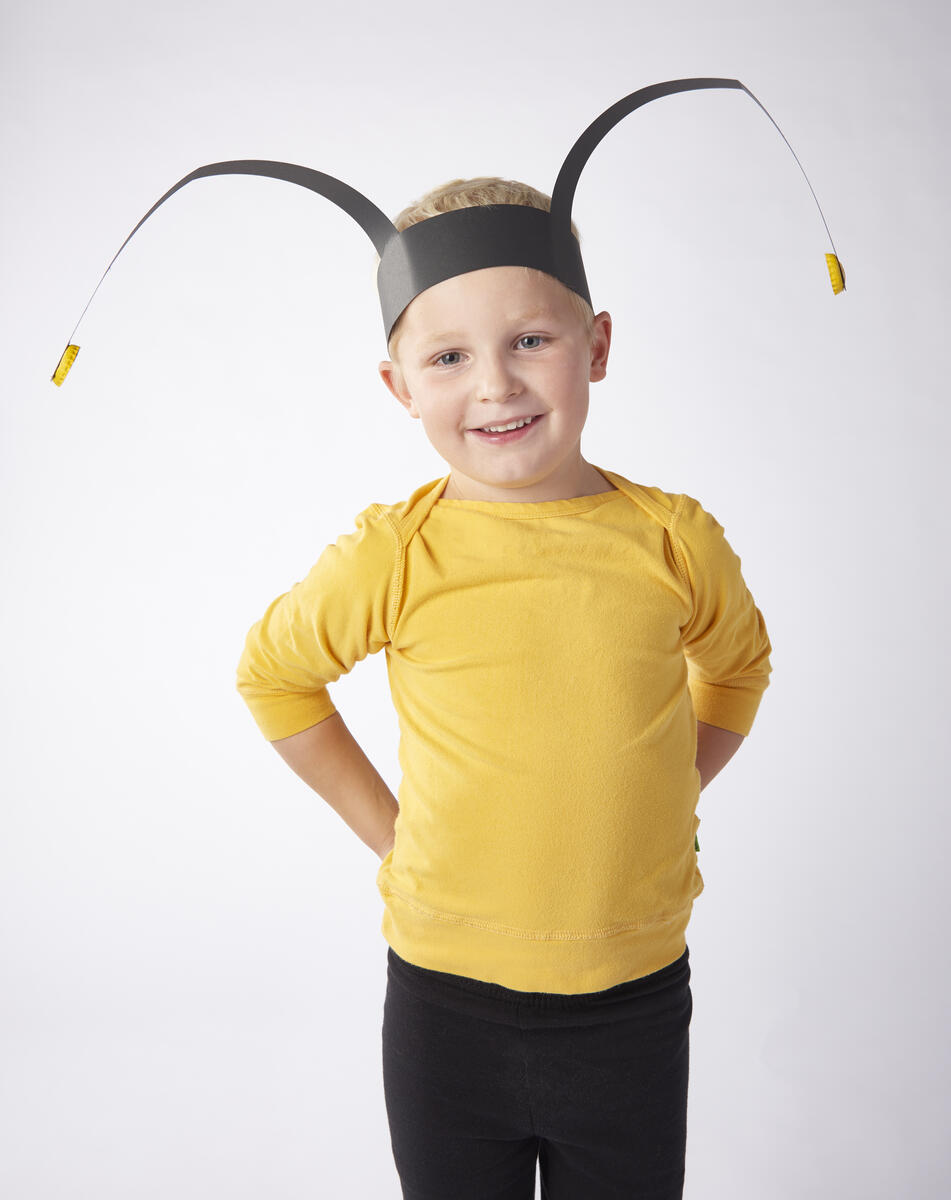Mät runt huvudet och nita ihop till en "krans" i lagom storlek. Markera ungefär vid tinningarna på kransens ovankant.