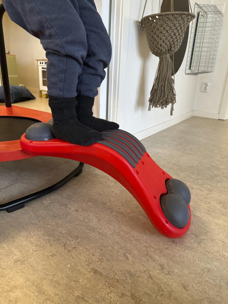 - Efter ett tag kom de även på idén att lägga upp ena delen av balansbrädan på vår studsmatta. Nu blev det ännu svårare att hålla balansen när de skulle gå ner för den. En del barn valde att kana ner på rumpan istället. Tips från Kubeliden Montessori.
