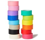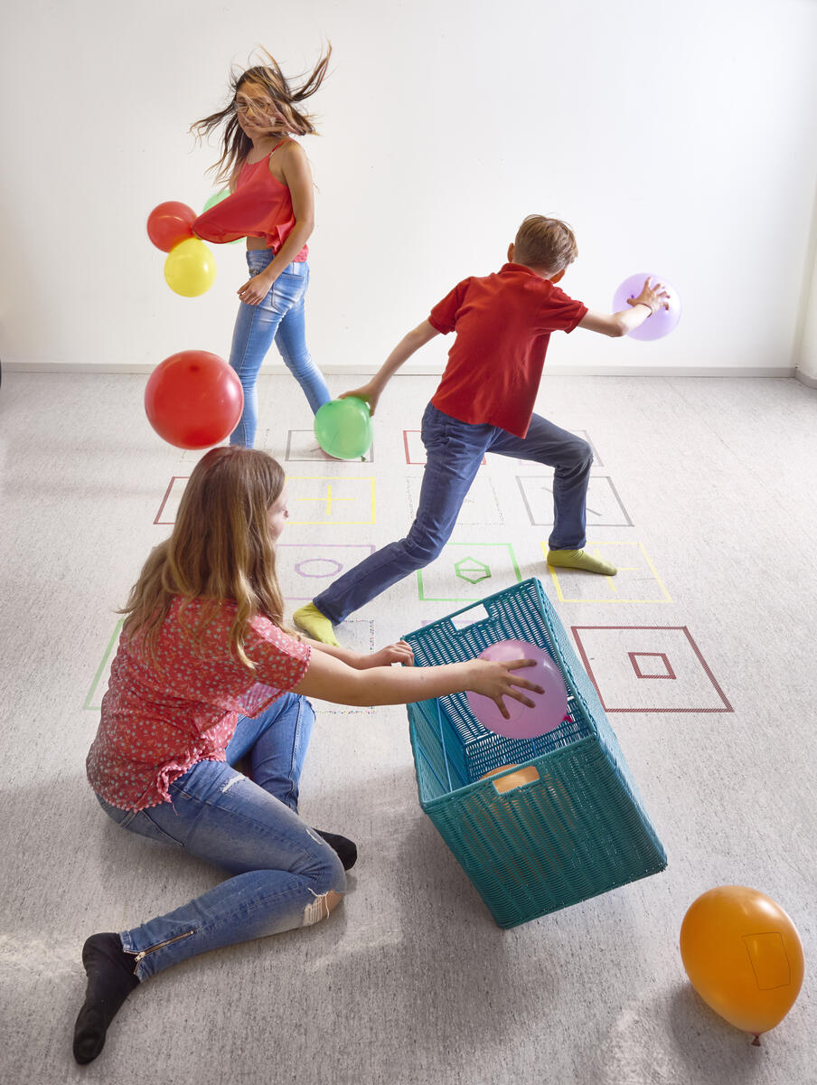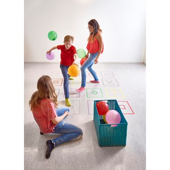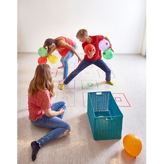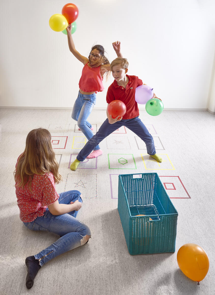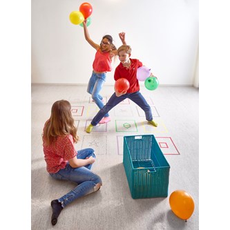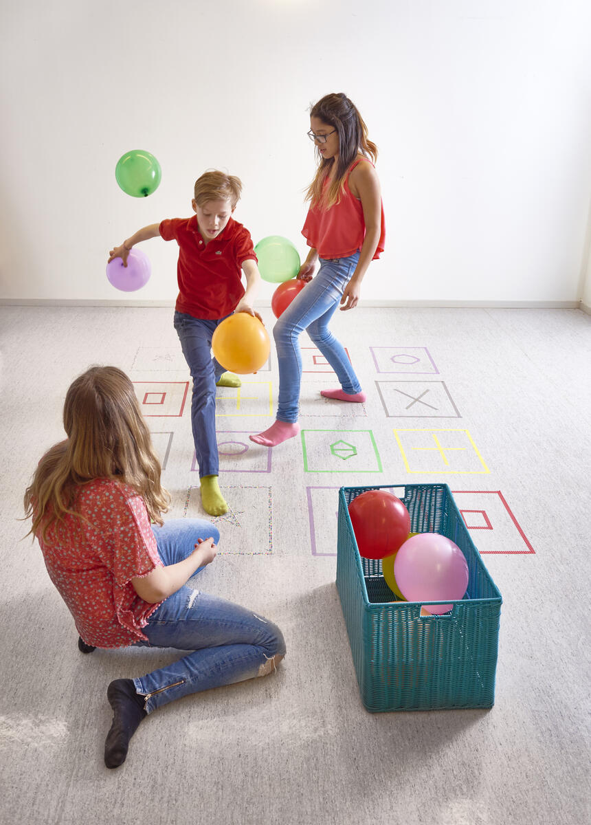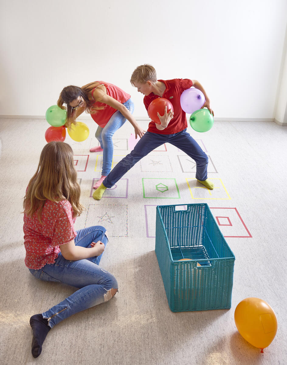 Gör fyrkanter på golvet med hjälp av washitejp. Storleken kan vara 25x25 cm. Vi har gjort 16 stycken (fyra lodrätt och fyra vågrätt).