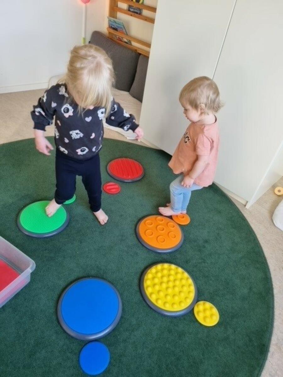 - När vi introducerar övningen för de små barnen börjar vi med att lägga ut två av de stora plattorna framför barnet. Vi pratar om färgerna och känner på plattorna. Vi lägger sedan en av de små plattorna i påsen och barnen får känna och försöka matcha med plattorna som ligger på golvet. Efter hand som de utvecklas och förstår övningen kan vi lägga till fler och fler plattor. Med denna övning tränar vi färger och former, använder vårt känselsinne och språk. Vi tränar koncentration, minnesförmåga och problemlösning. När flera barn arbetar tillsammans tränas även turtagning, samarbete och kommunikation. Tips från Kubeliden Montessori.