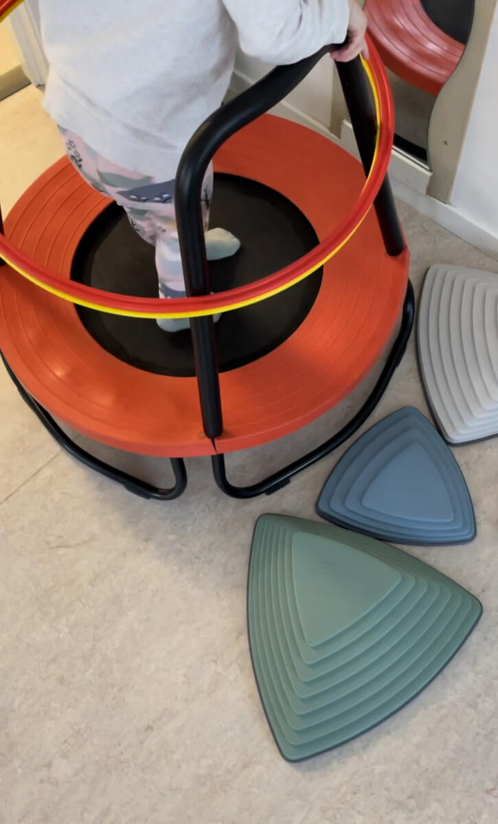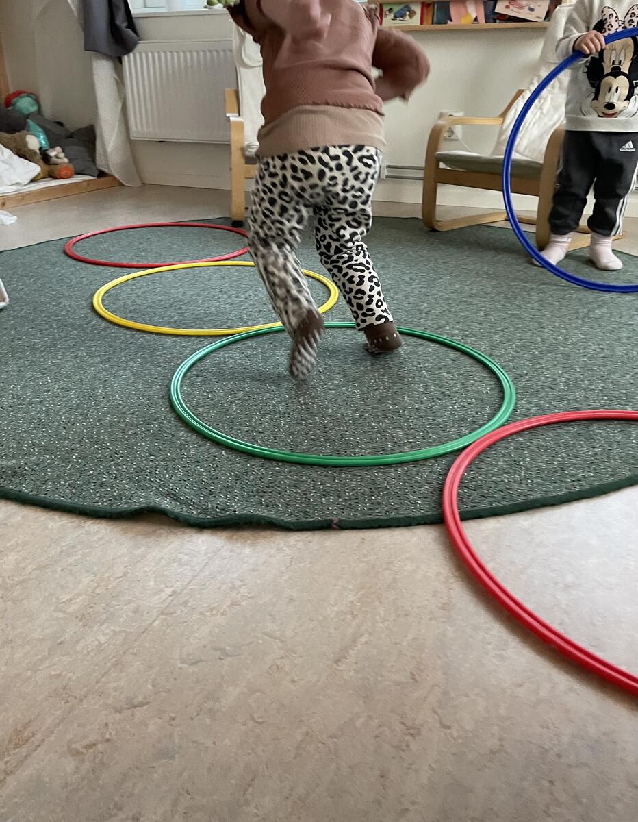 - En mer uppstyrd övning är att lägga ner ringarna på golvet och låta barnen balansera på dem och gå runt.