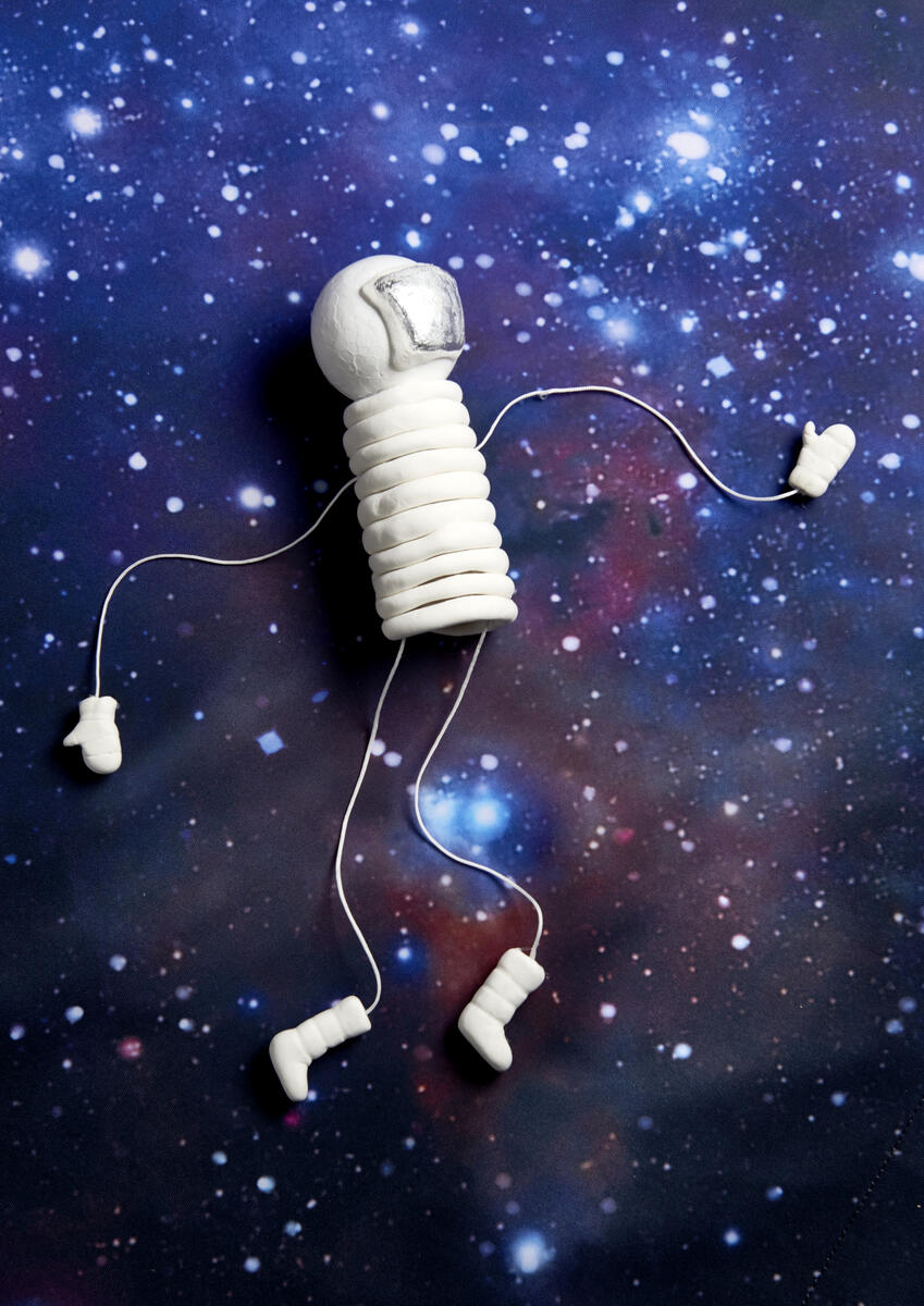 6. Gör en fyrkant av lera och limma fast som visir på styroporkulan. När den har torkat, måla den silvrig.