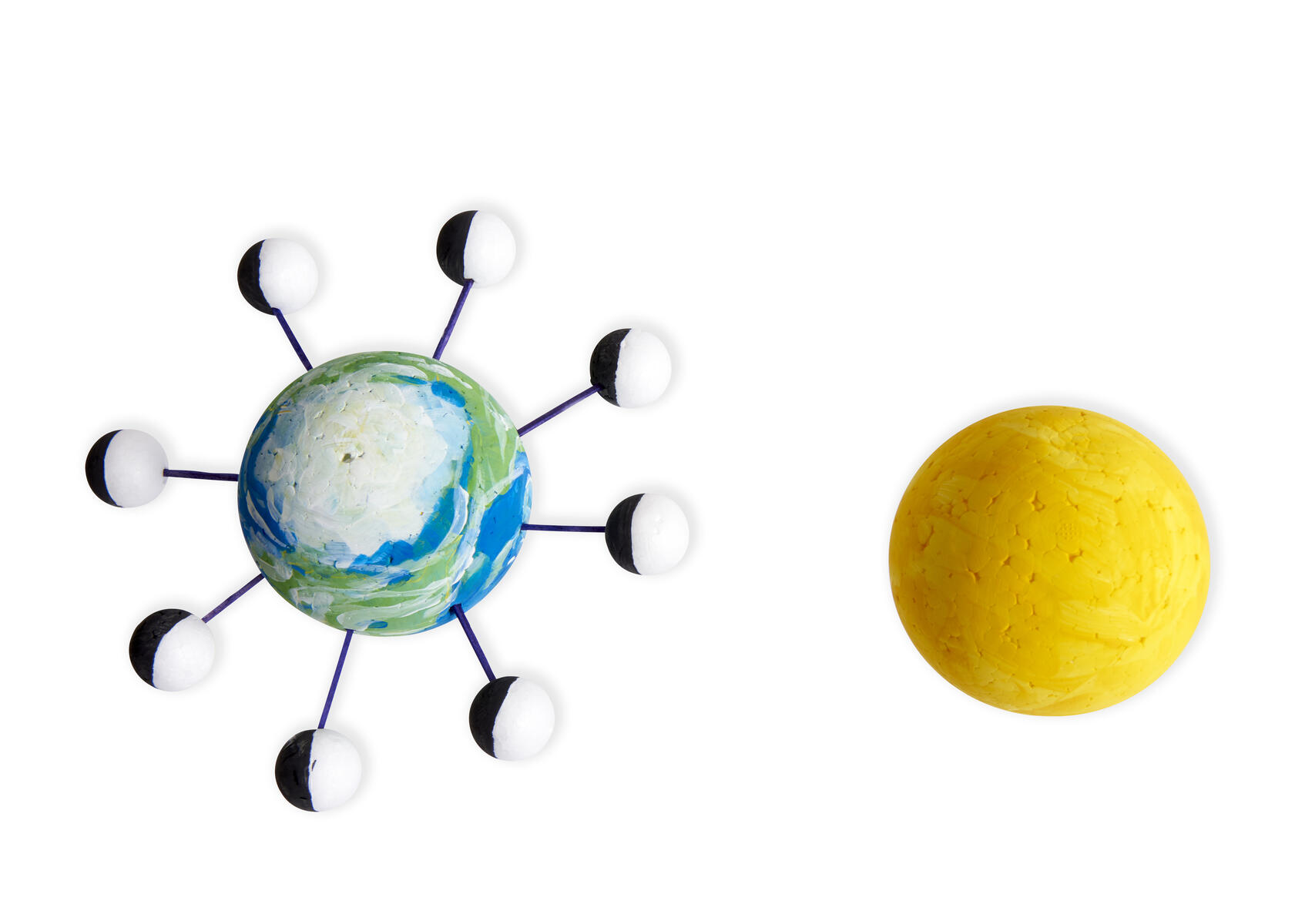 Fäst tandpetare i en ring kring jorden. Börja med att sätta en längst upp (klockan tolv) och en nederst (klockan sex). Fortsätt ned att sätta en på mitten mellan dessa. (klockan tre och klockan nio). Sätt en mellan dessa. Fortsätt så tills du har totalt 8 månar runt jorden.