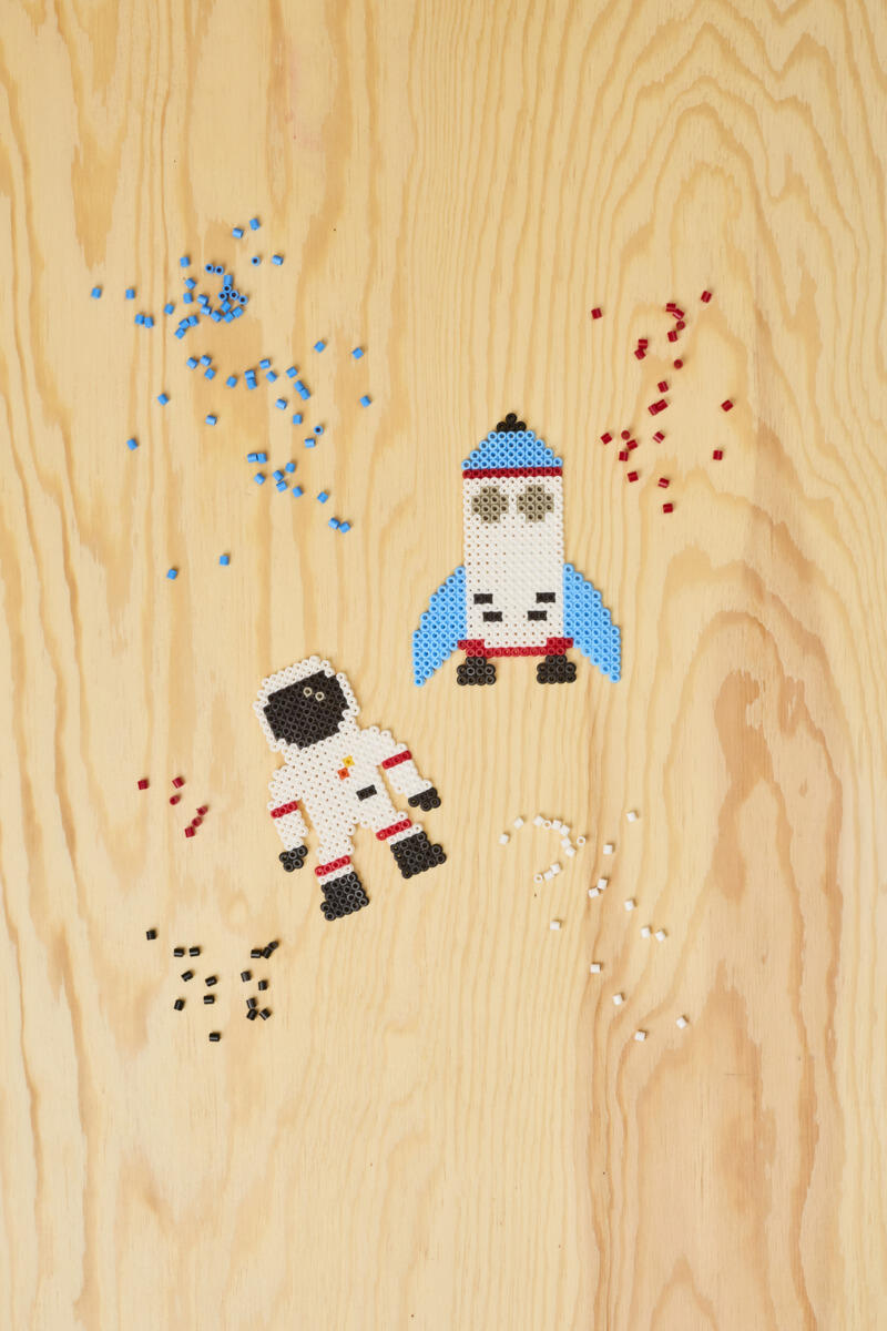 - Placera bakplåtspapper och stryk med strykjärn tills alla pärlorna smälts ihop. OBS! Ta hjälp av en vuxen när du ska stryka. Både strykjärnet och pärlorna blir mycket varma. Lägg något tungt över och låt dem svalna. Vill man undvika värme kan man istället använda limark för att hålla ihop pärlorna.