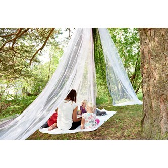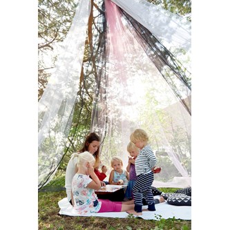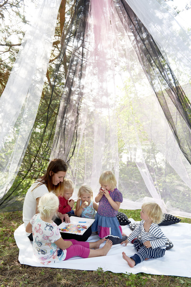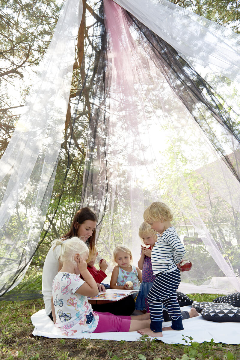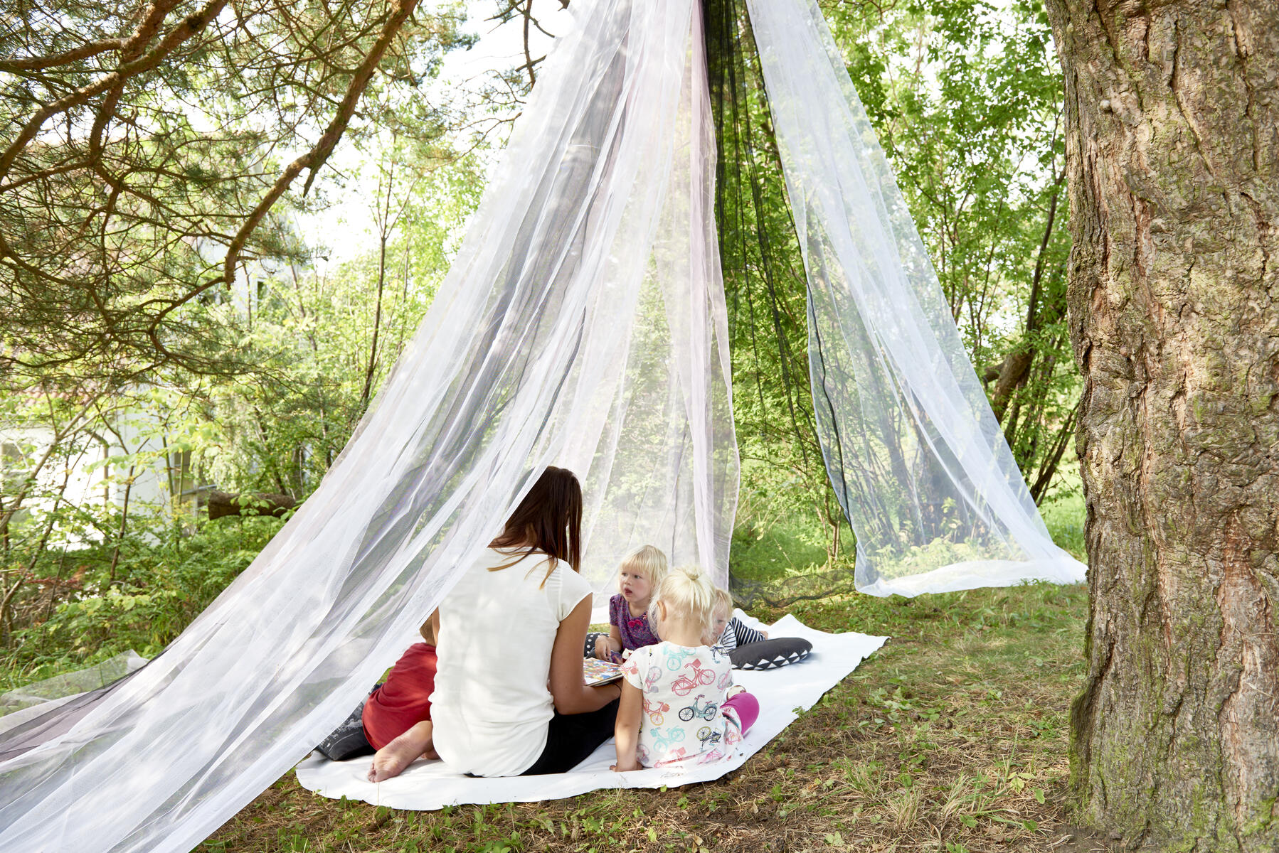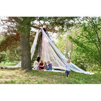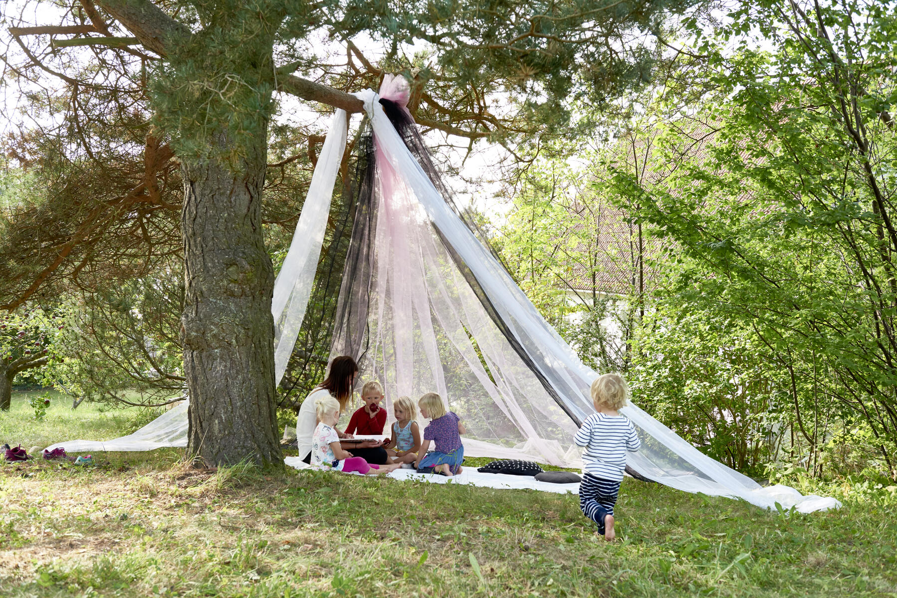 Knyt ihop två längder av tyll. Och häng över en trädgren. Mysighetsfaktorn blir högre om kojan kompletteras med filtar och kuddar.