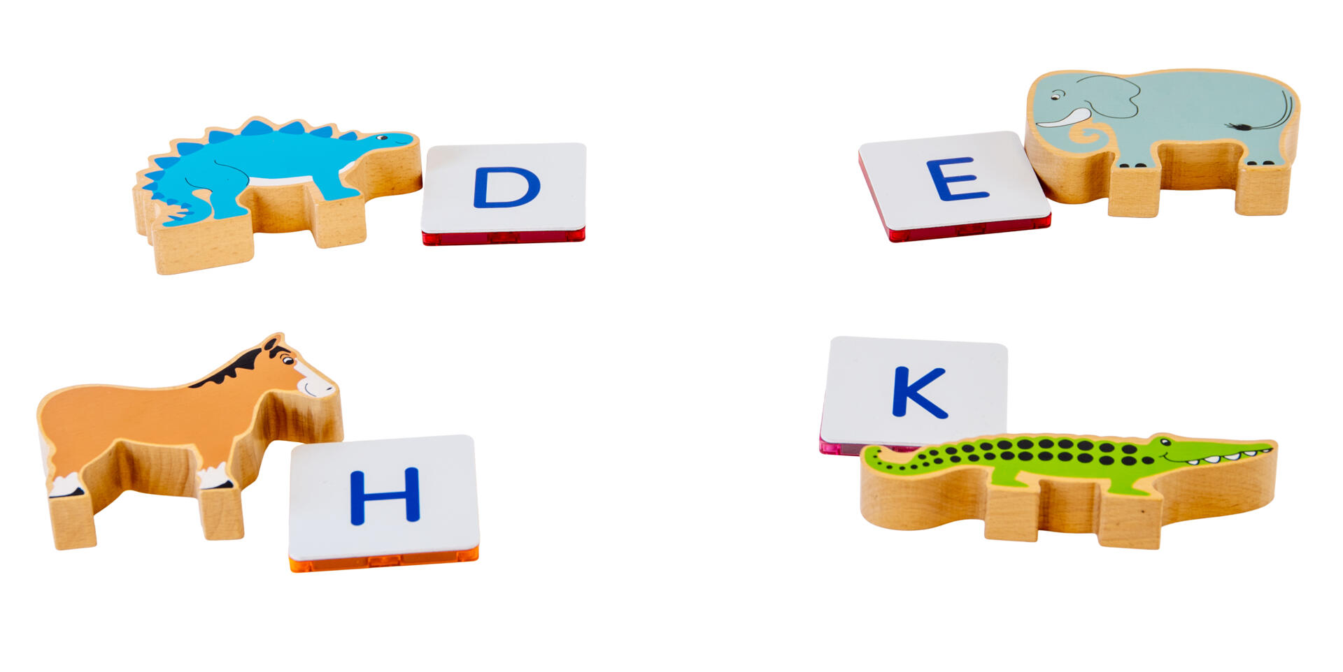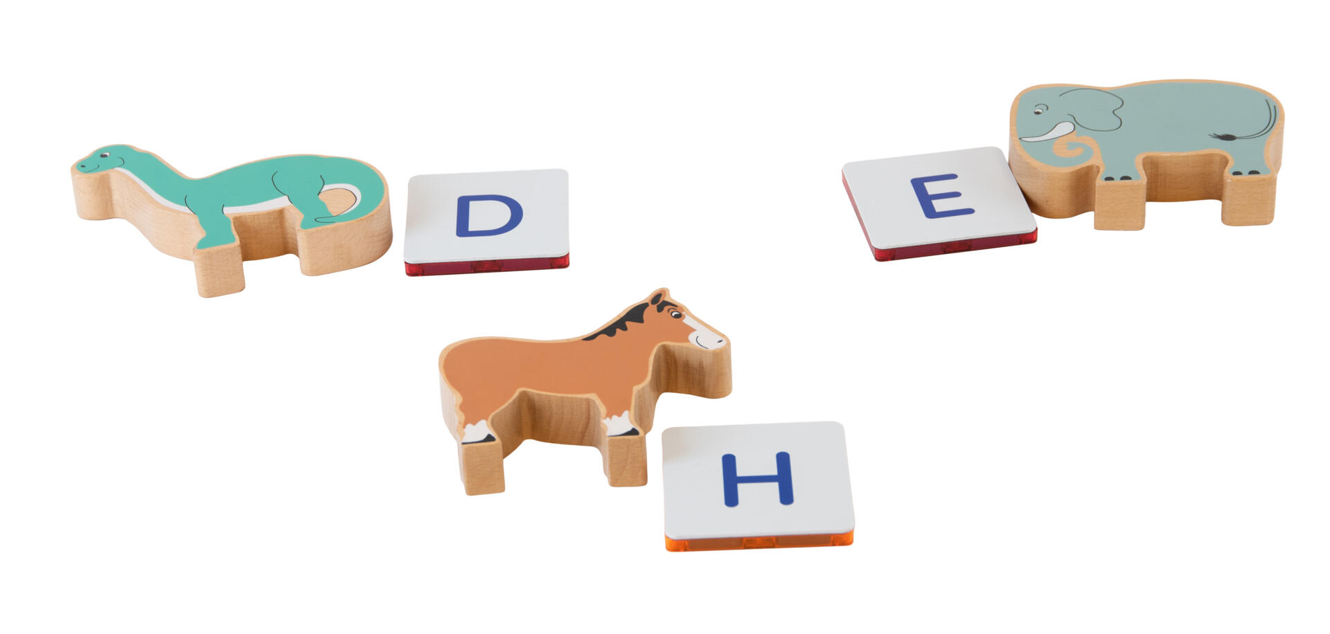 Ta fram olika saker som intresserar barnen. Vi använde oss av djur i trä. Träna på att hitta bokstaven (eller ljudet) som djuret eller saken börjar på. Para ihop bokstav och djur. Vill man kan man lägga djuren i en fin förvaringspåse och låta barnen slumpmässigt plocka upp djur ur påsen för att sedan hitta rätt bokstav och lägga ihop dem.