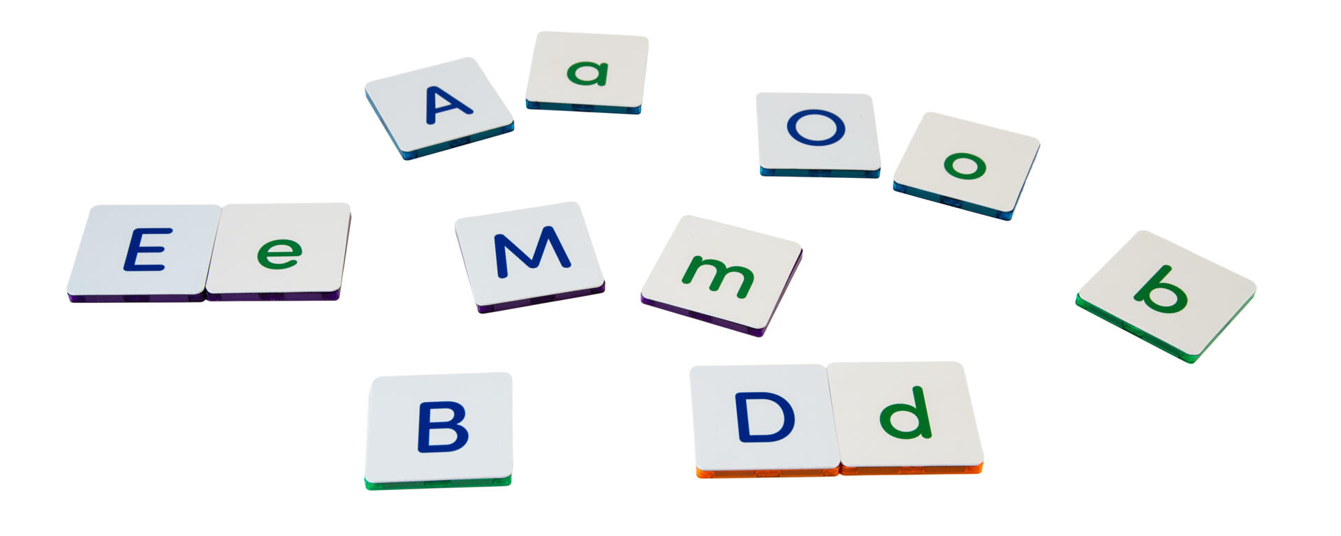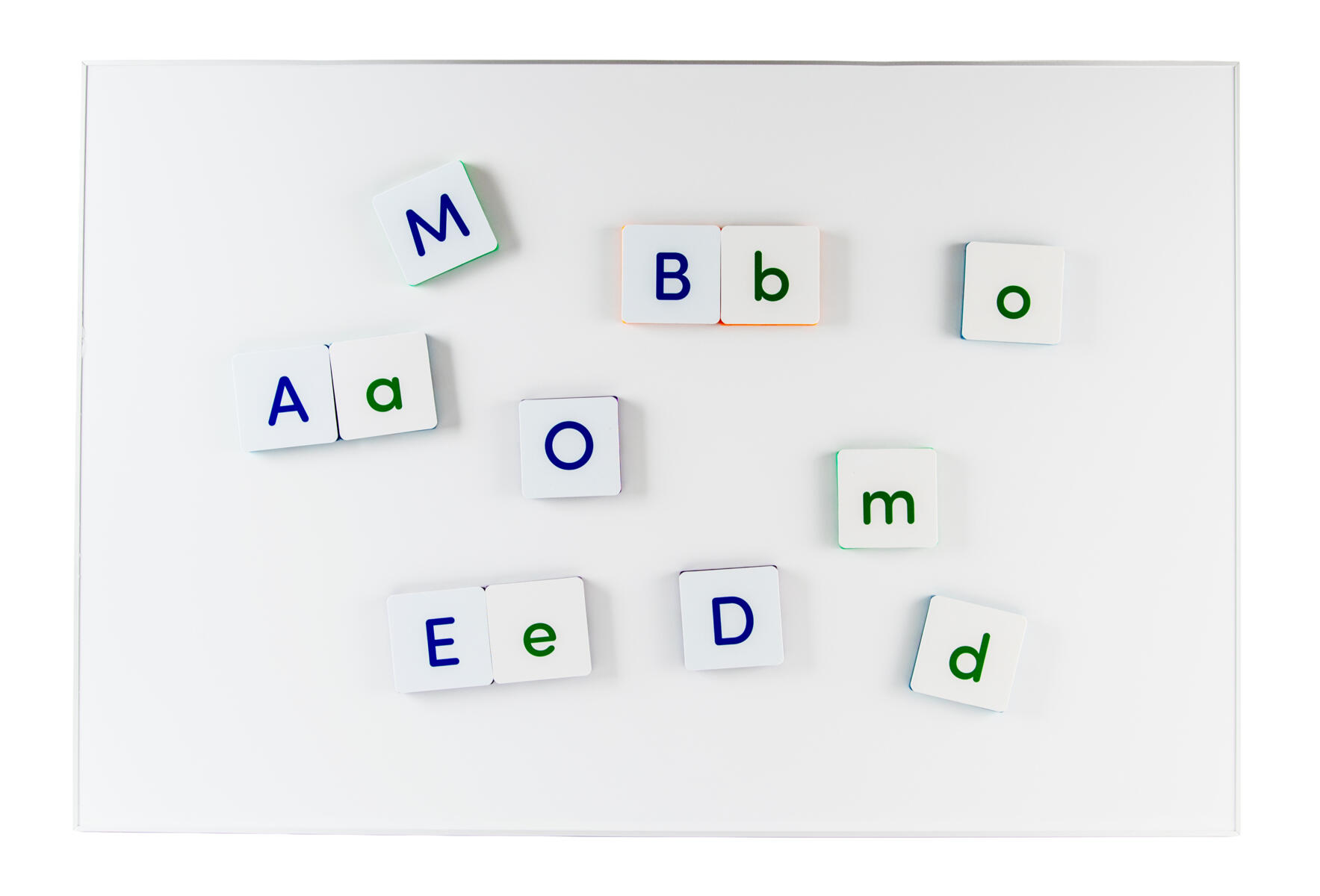 - Ta fram Mag Genius versaler och gemener samt kvadratiska byggbitar (det går att göra denna övningen utan byggbitarna, bokstäverna i sig är magnetiska och fastnar på t.ex. whiteboarden). Använder man byggbitarna placeras bokstäverna på varsin bit.