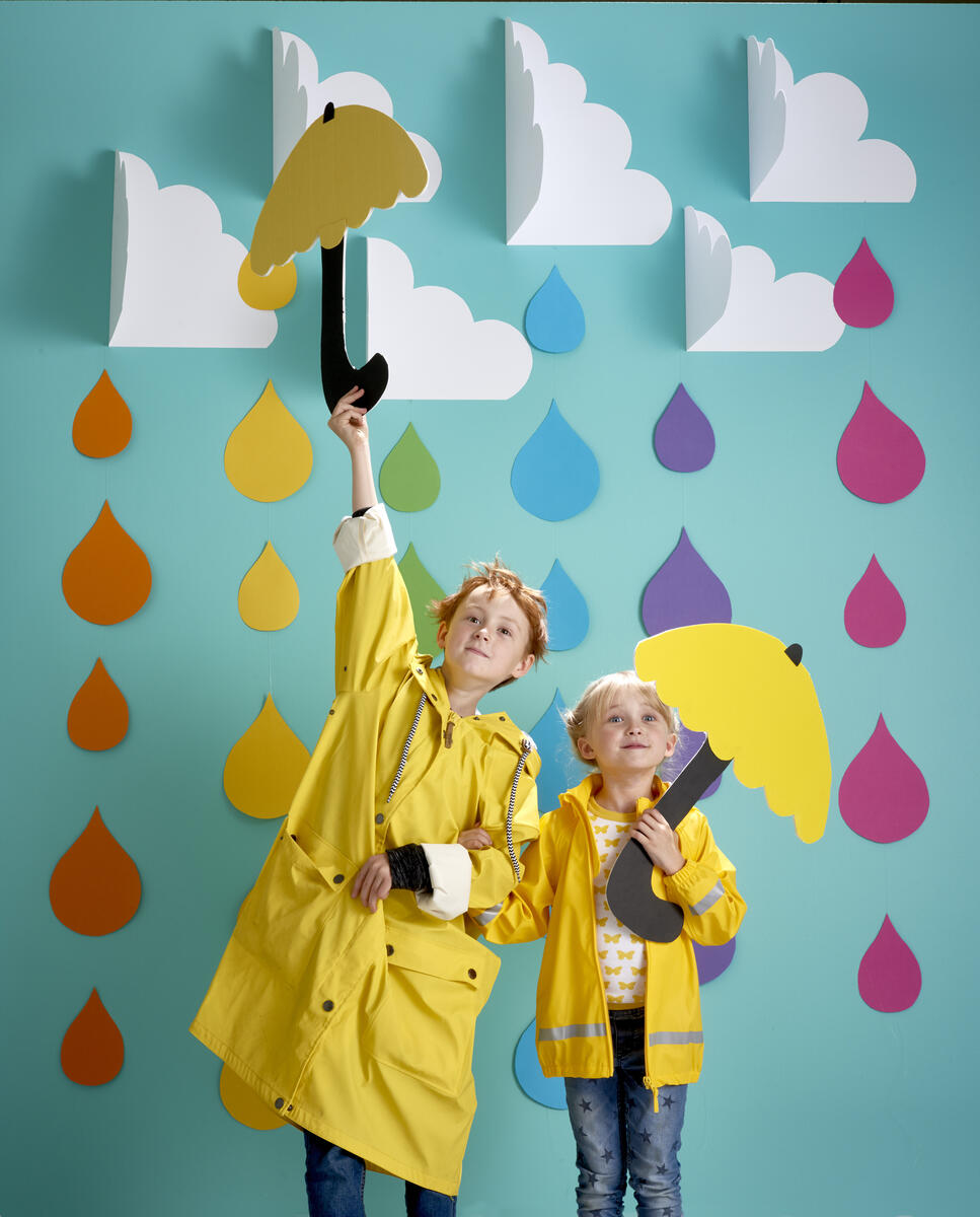 Gör dropp-mallar i 2 storlekar och klipp ut i olika färger. Fäst med limpistol på en fiskelina. Sätt en spik under molnet och fäst linan i spiken.