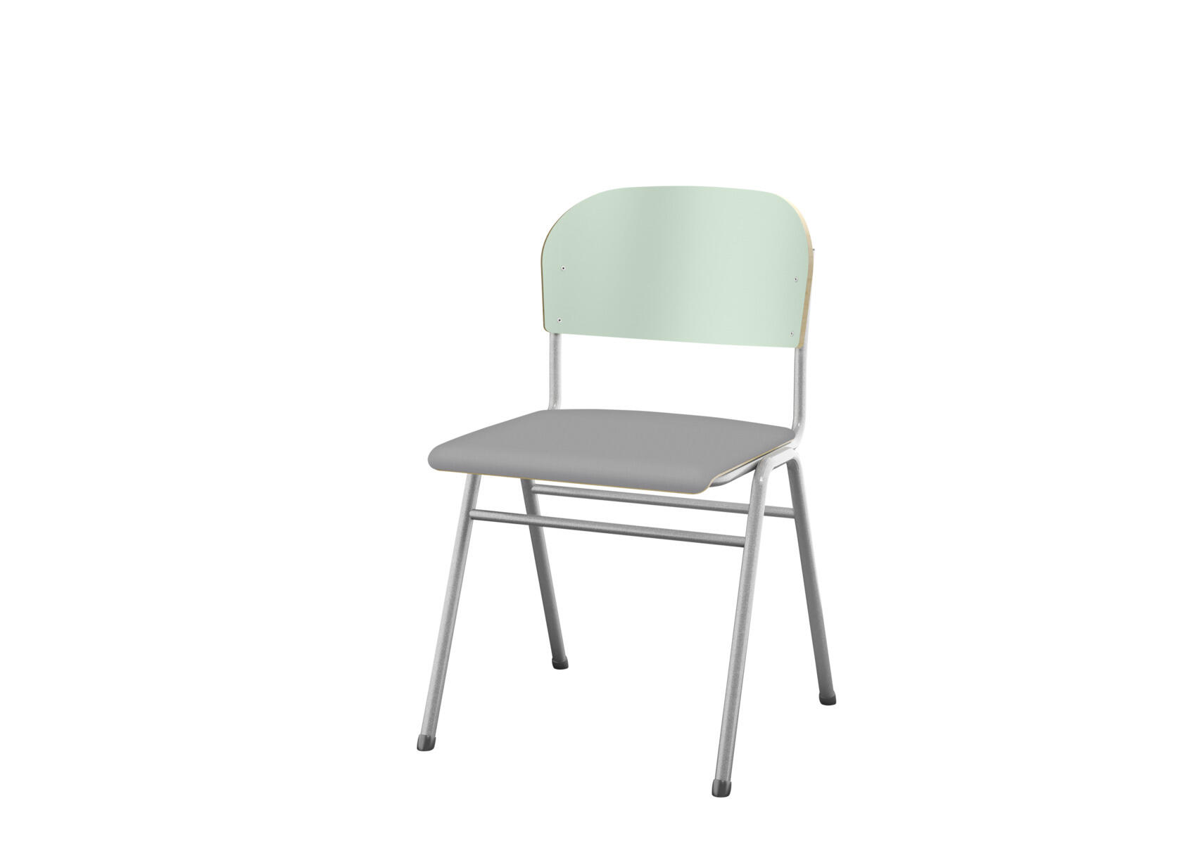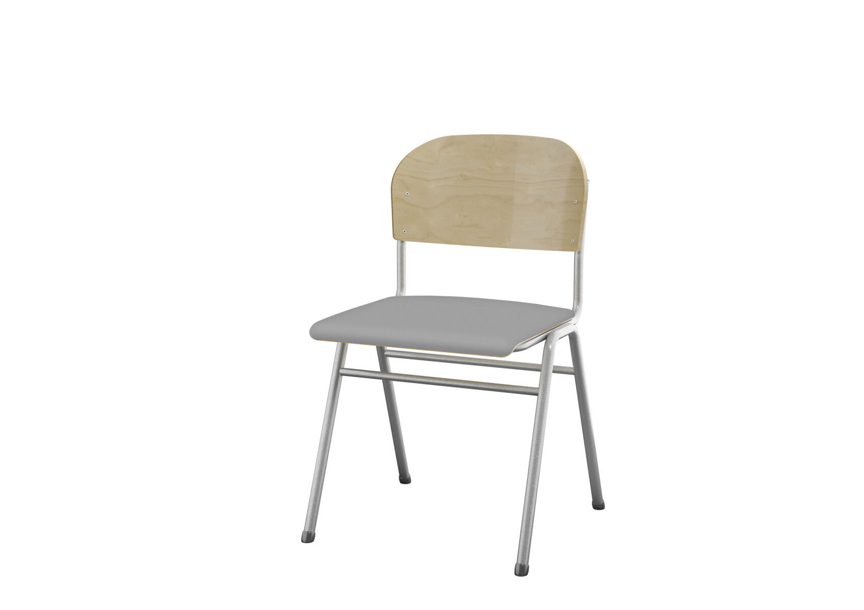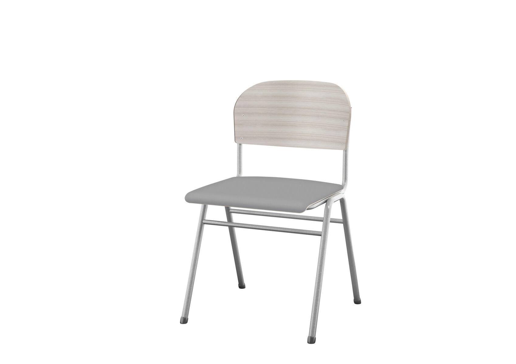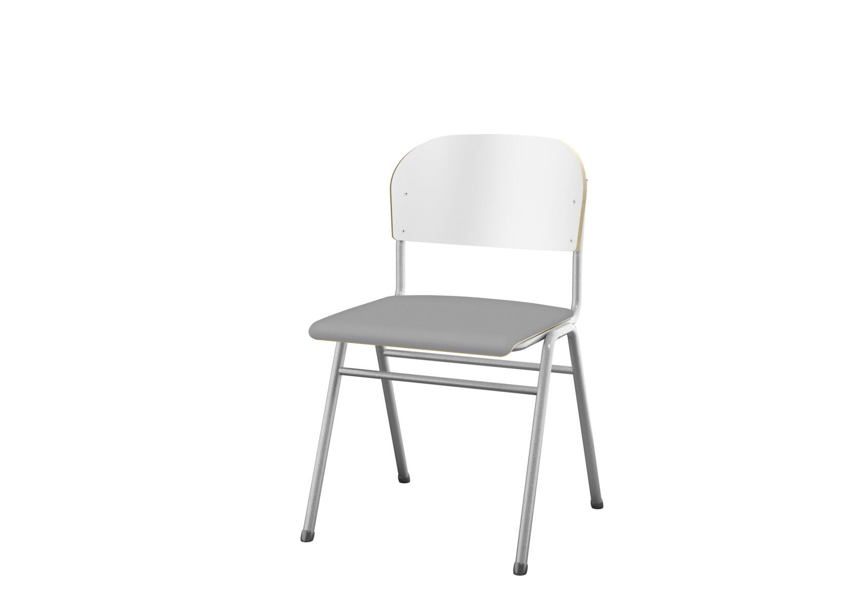 Stapelbar (max 4 st/stapel). Ljuddämpande tassar. Upphängningsbar på bord. Reglerbar fotbräda i 3 fasta lägen. Sitthöjd 50 cm. Sitsmått: B36xD35 cm. Totaldjupet på stativet är 54 cm. Vikt 4,6 kg. Sits och rygg i högtryckslaminat. Silverlackerat stativ, RAL 9006.