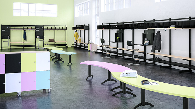 Dagens entré kan utformas till något mer än det sedvanliga. Utöver en strukturerad kläd-och skoförvaring kan man exempelvis förvandla utrymmet till en miljö för inhämtning och interaktion, genom att utrusta den rymliga entrén med extra arbetsplatser samt smarta laddstationer för iPads och datorer.