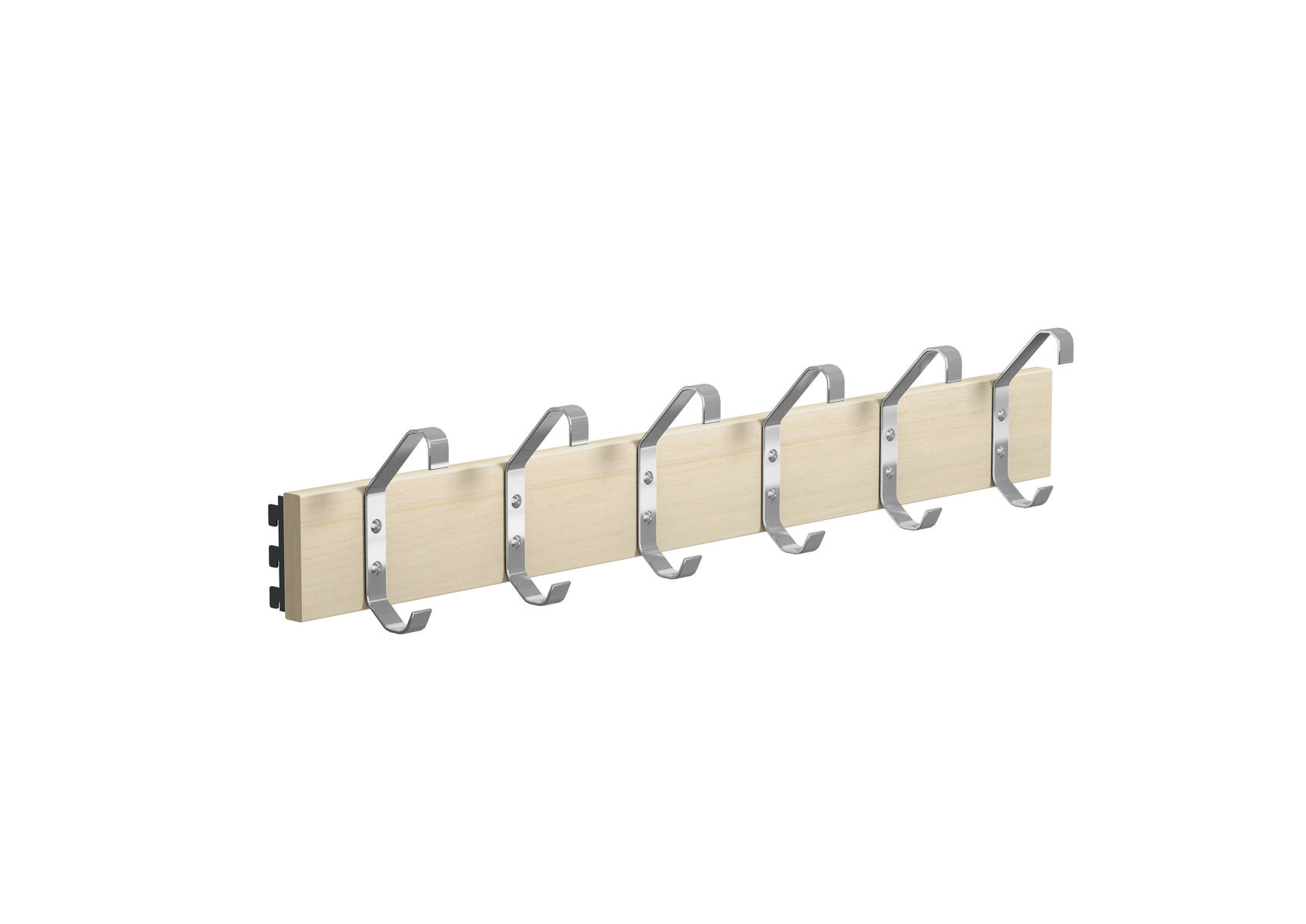 Använd till Wille skensystem. Passar till både vägghängda och fristående modeller. Enkelt att justera i höjd. Det krävs montering av kroklist. Lätt att rengöra, torka med fuktig trasa. 6 krokar på massiv lackad björk. Höjd 10 cm.