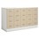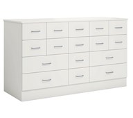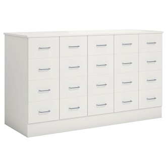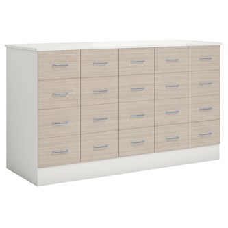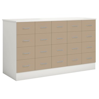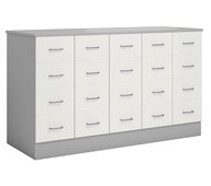 Köpmansdisk med 16 lådor, 12 små lådor och 4 stora lådor. Stomme i direktlaminat. Lådfronter och topplatta kan fås i direktlaminat eller högtryckslaminat. På sockel, lådor kompletta med handtag.