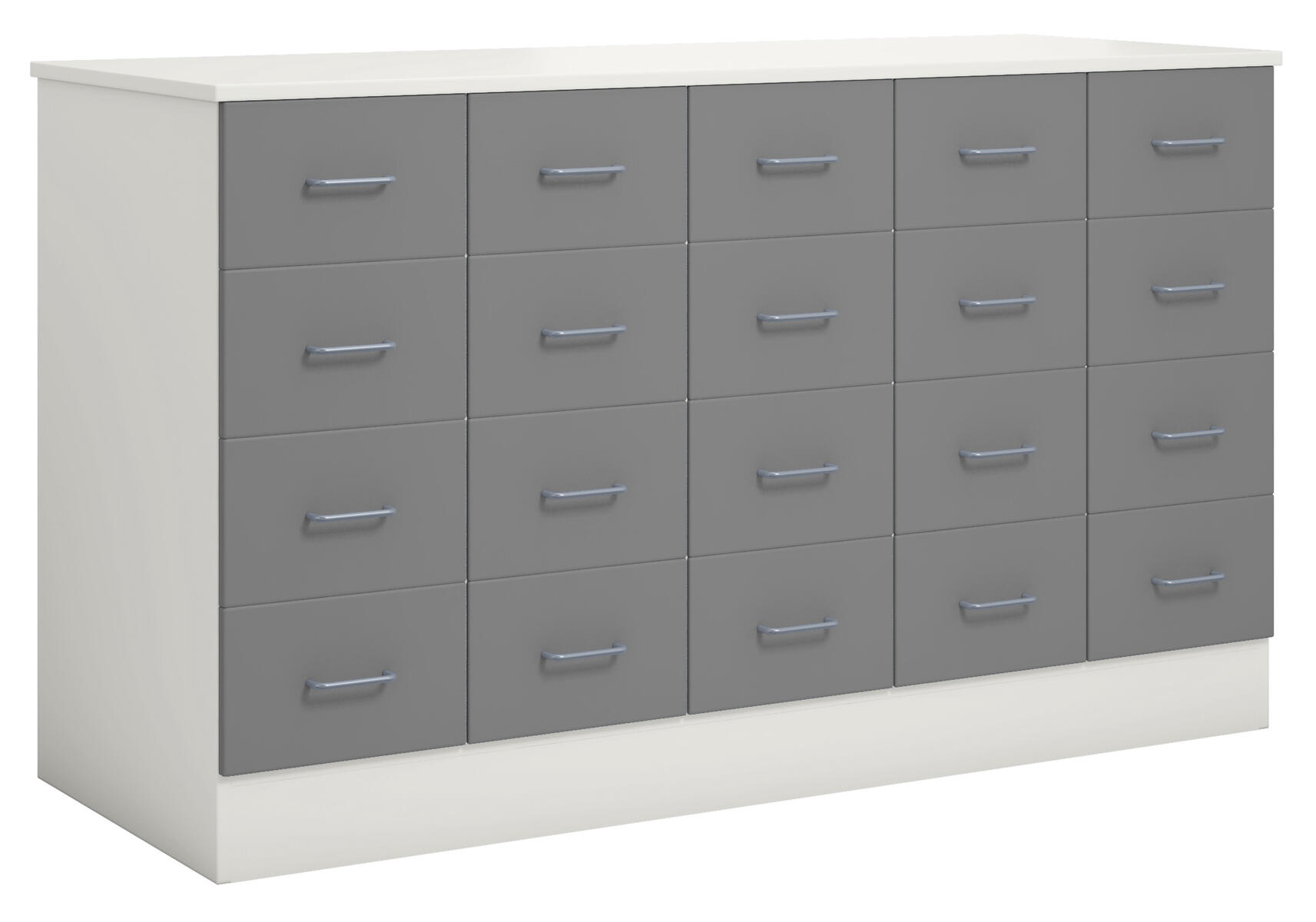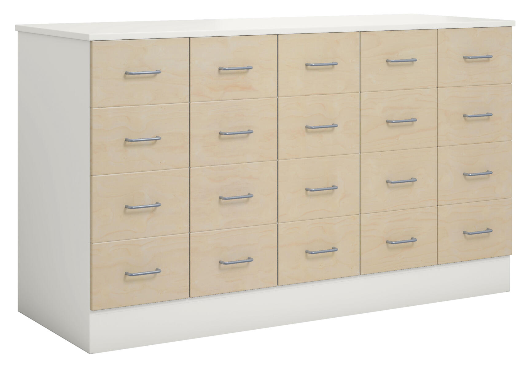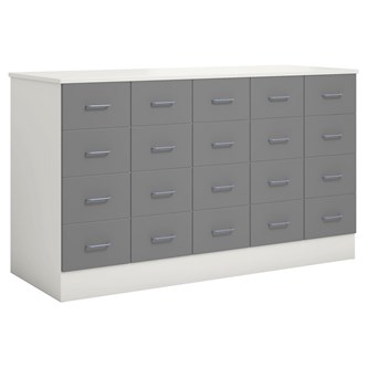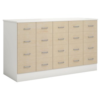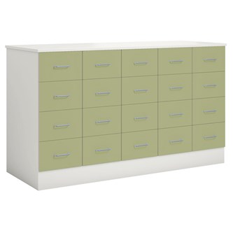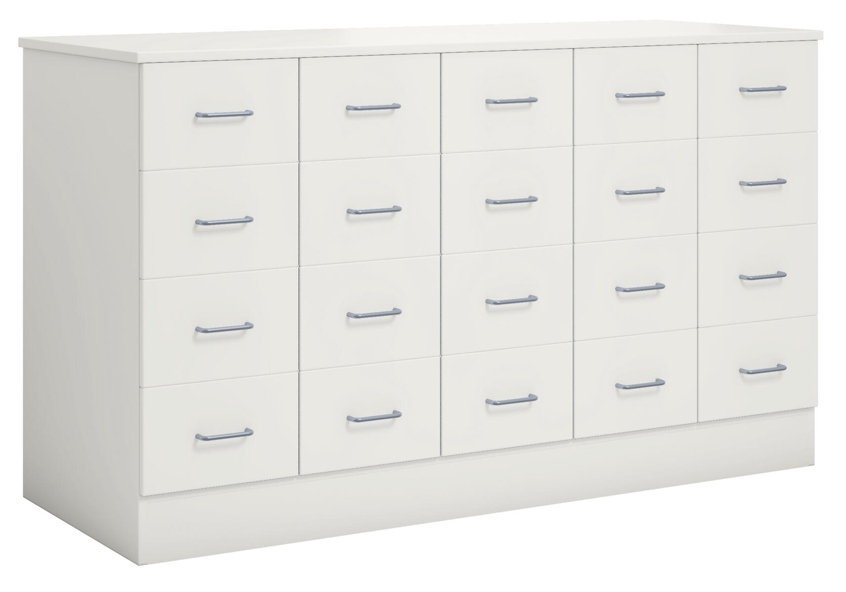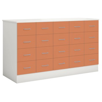 Köpmansdisk med 20 lådor, alla i samma storlek. Stomme i direktlaminat. Lådfronter och topplatta kan fås i direktlaminat eller högtryckslaminat. På sockel, lådor kompletta med handtag. Lådornas innermått: B25xD49xH10 cm.
