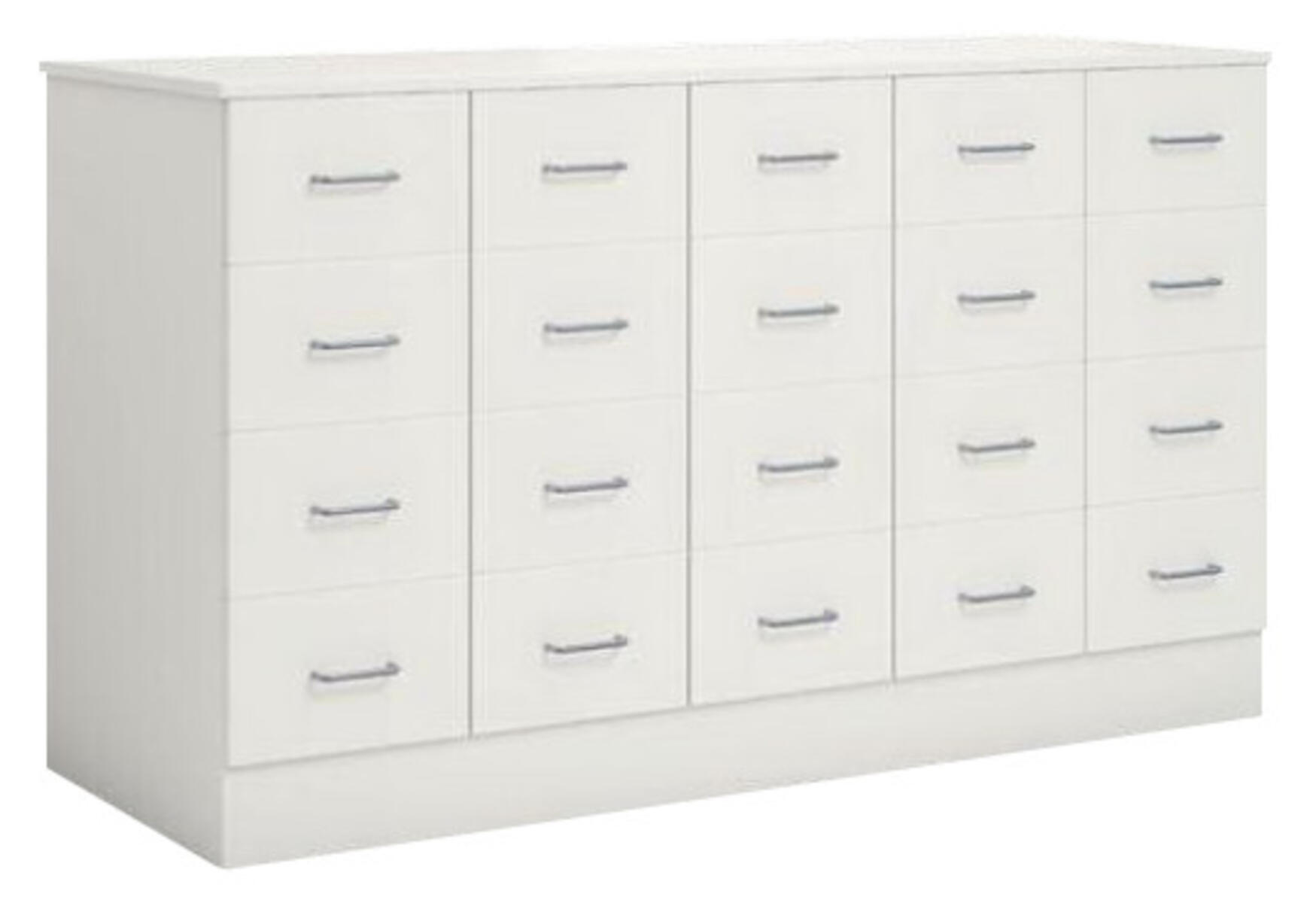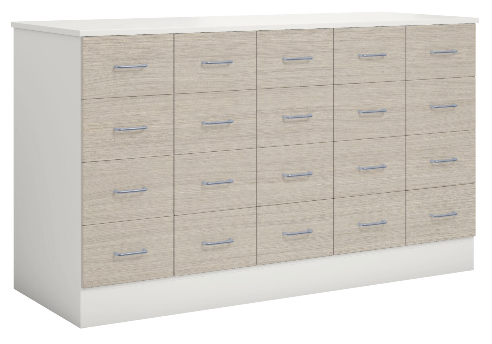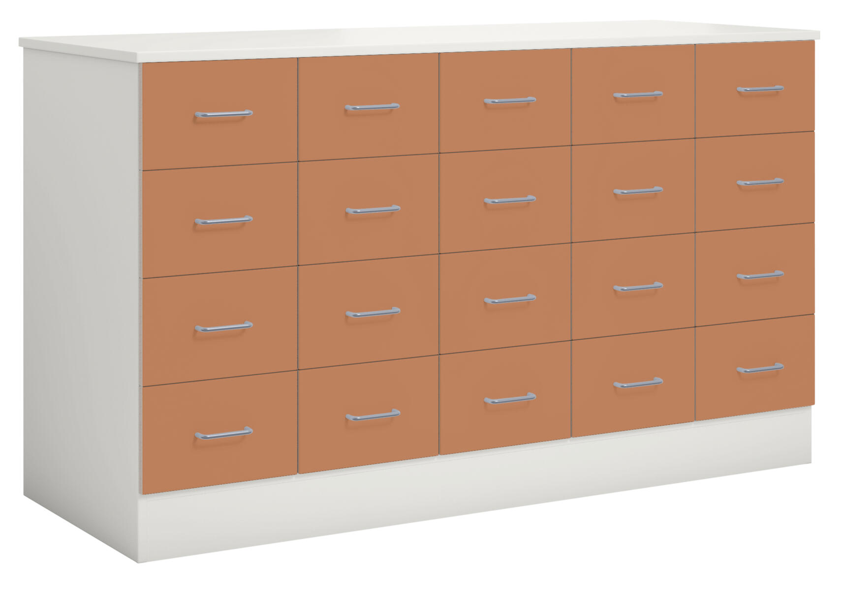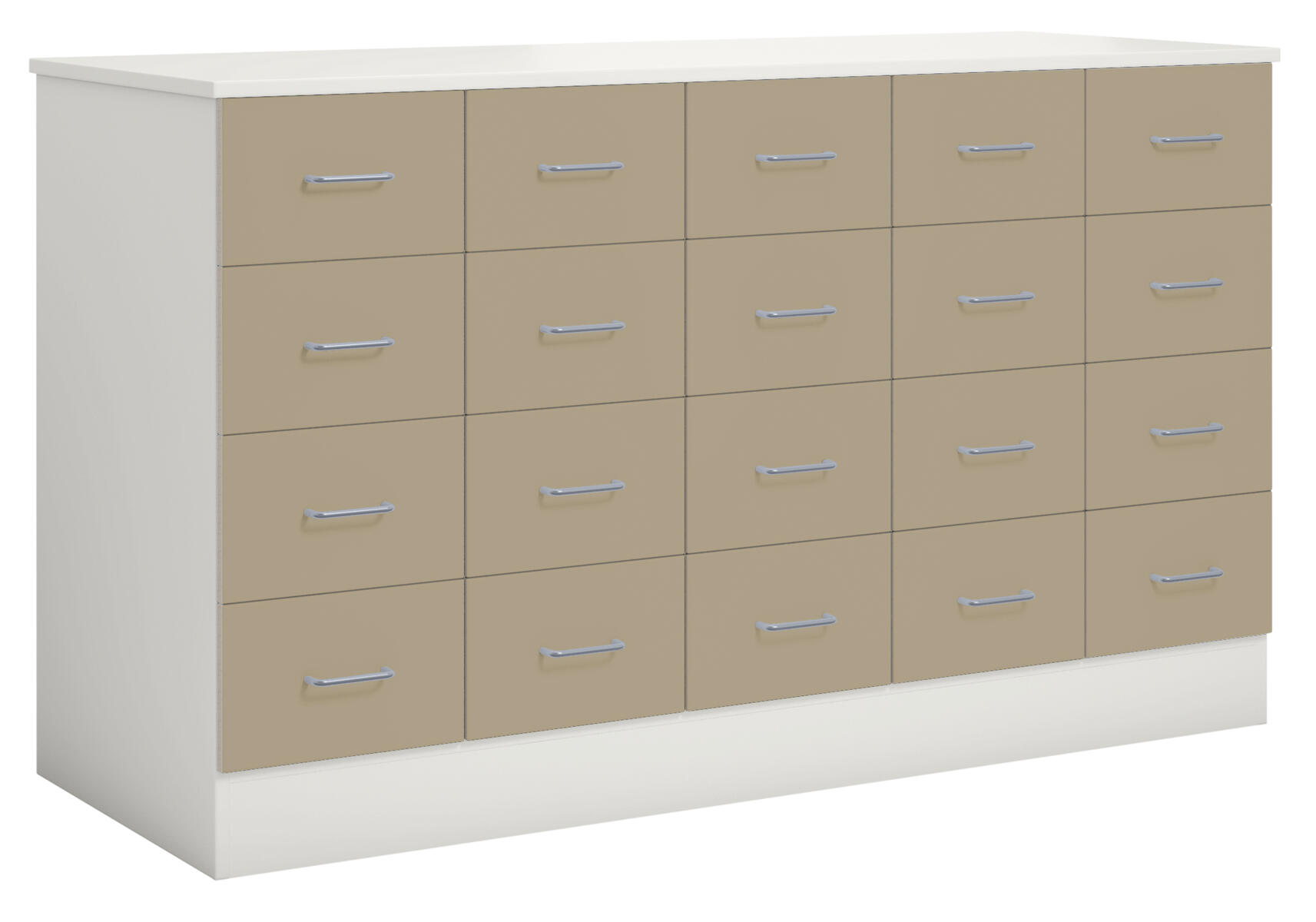 Köpmansdisk med 20 lådor, alla i samma storlek. Stomme i direktlaminat. Lådfronter och topplatta kan fås i direktlaminat eller högtryckslaminat. På sockel, lådor kompletta med handtag. Lådornas innermått: B25xD49xH10 cm.