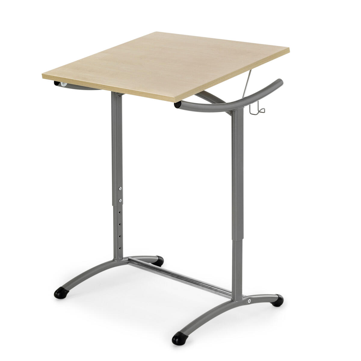 Skivan kan vinklas 8, 12 eller 16 grader. Ställskruvar på alla ben. Dubbla väskkrokar. Mått: B70xD60 cm. Arbetshöjden justerbar mellan 65 och 88 cm. Bordsskiva i massivt trä. Stativ i silver, RAL 9006.