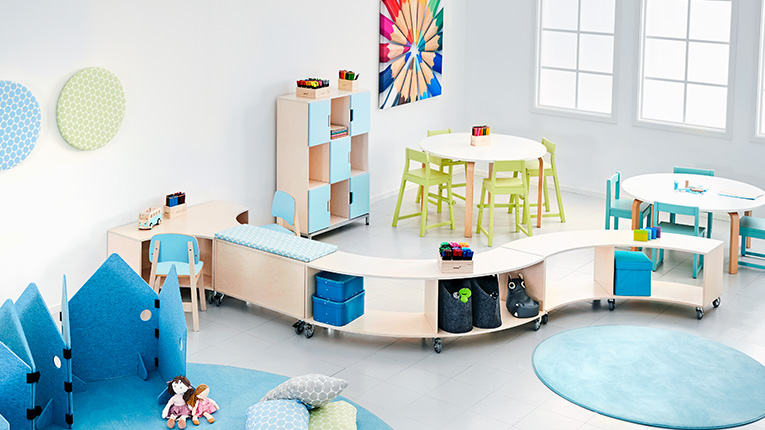 När förskolorna växer och flera avdelningar delar på gemensamma ytor, både inne och ute, behövs en plats som gruppen känner är sin egen. Mattor för samling, madrasser för vilstunder och matbord och stolar för frukost, lunch och mellanmål. Även förvaring för personliga saker som extrakläder, gosedjur och nappar är viktiga möbler för hemvisten.