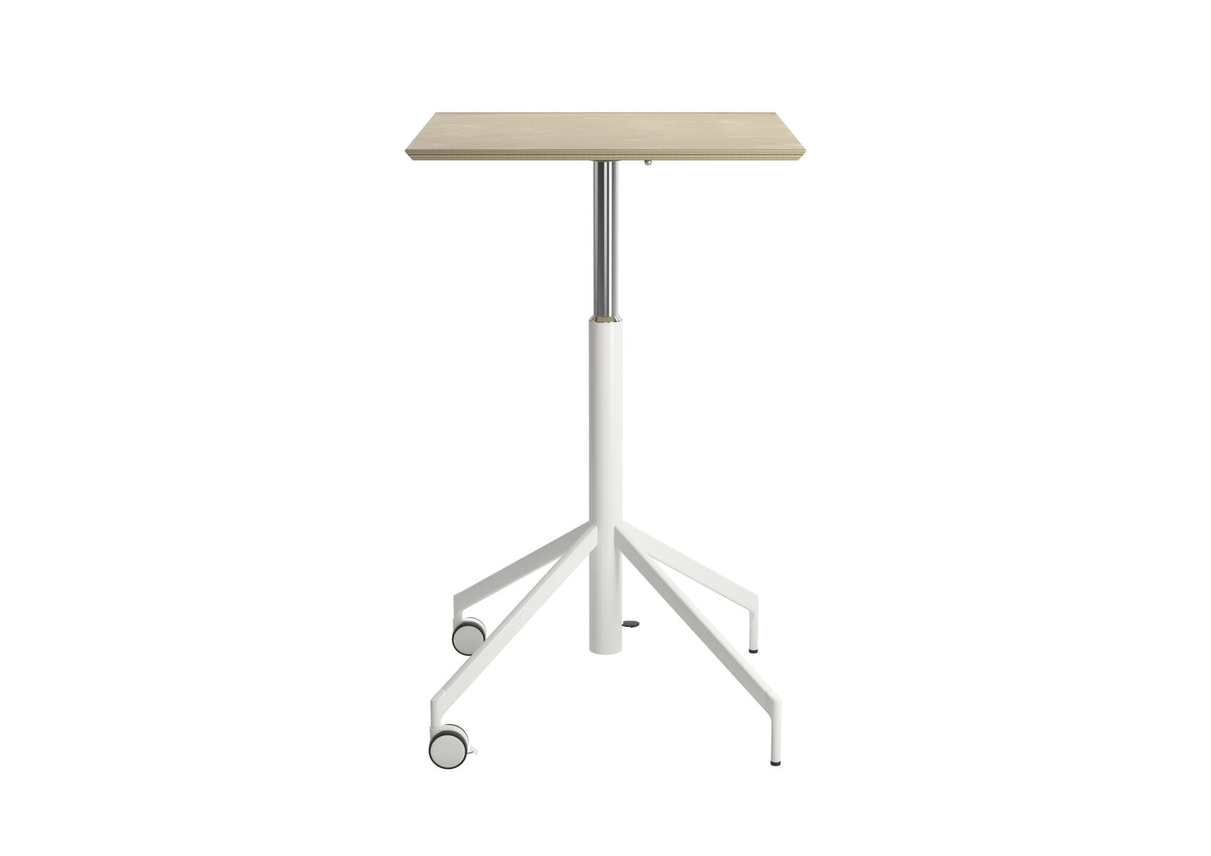 Ett höj- och sänkbart bord med fällbar skiva. Fäll skivan och rulla undan när plats behövs till annat. Höjd justeras smidigt med gasfjäder 73–118 cm. Vitlackerat stålrör i RAL 9016. 2 låsbara hjul. Skivan har måttet 65x65 cm och är i akustik linoleum.