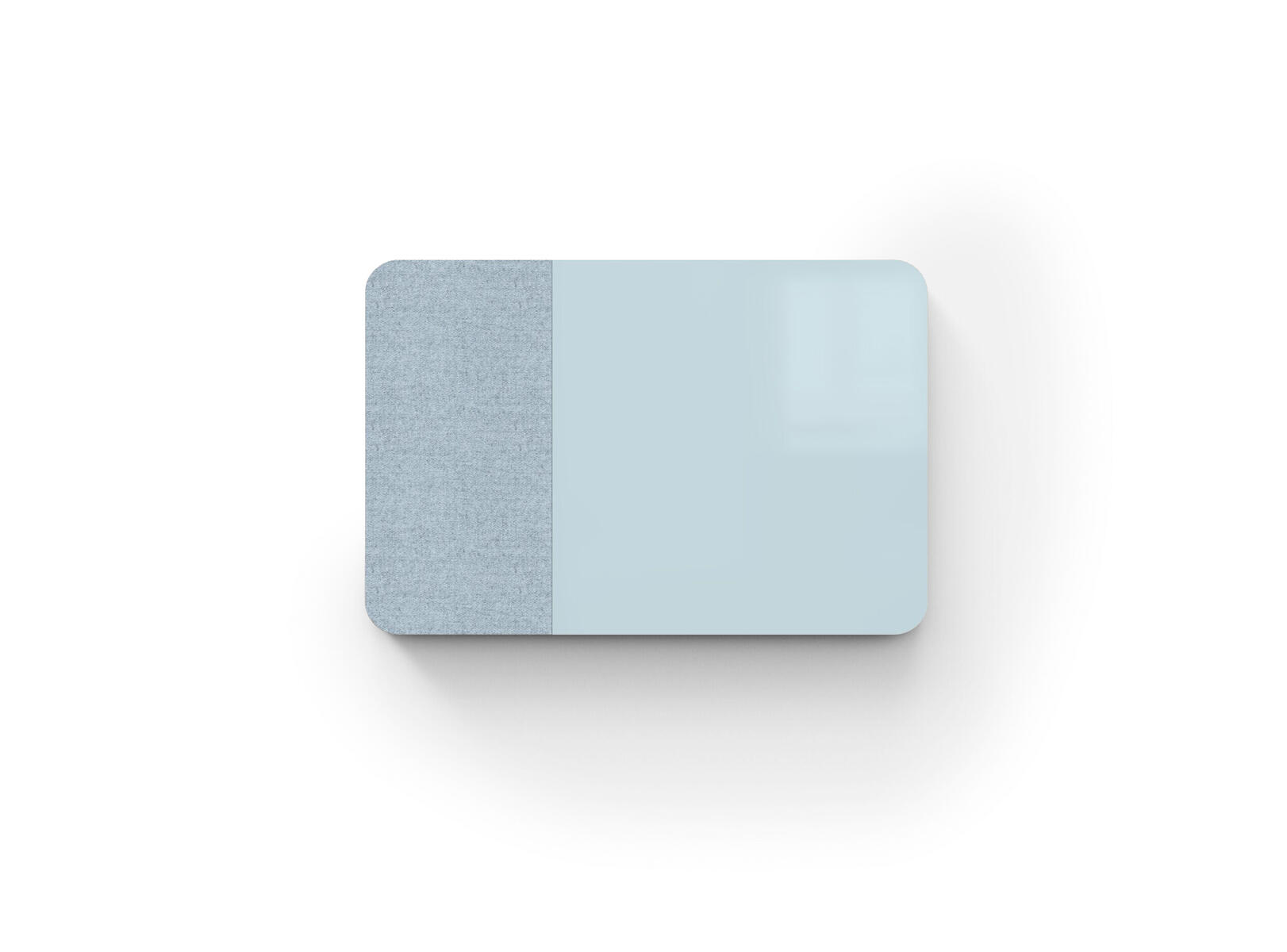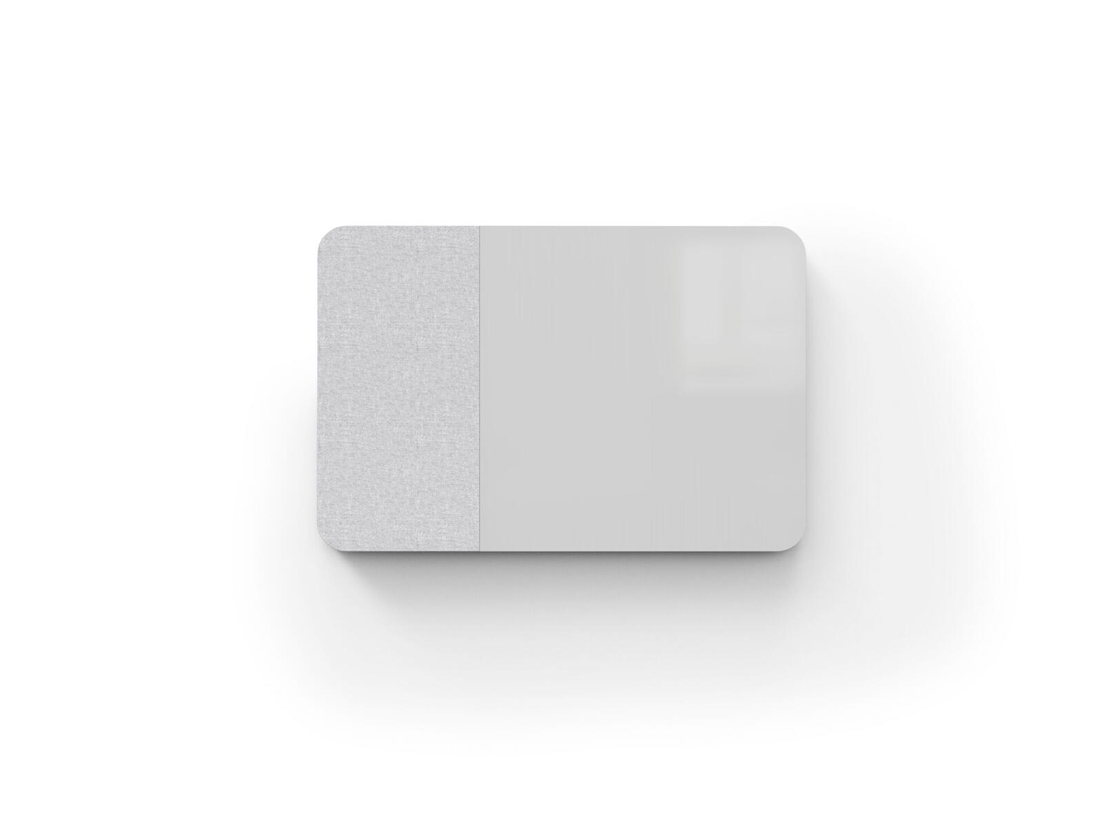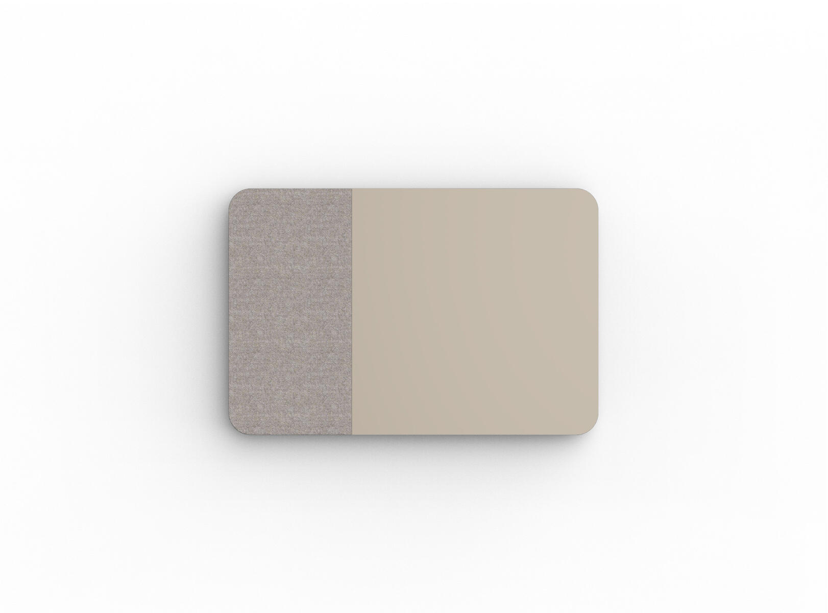 Tavla med kombination av tygklädd yta, skrivbar, magnetisk glasyta samt ljudabsorberande fyllning. Den tygklädda ytan är 50 cm bred. Dolda beslag.