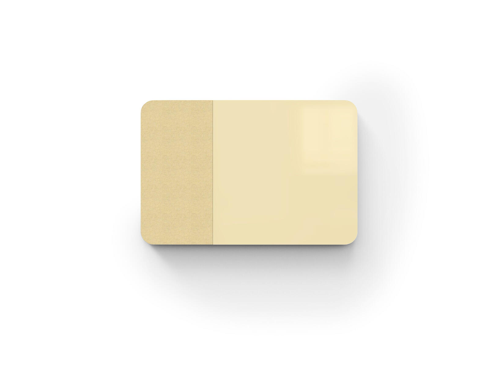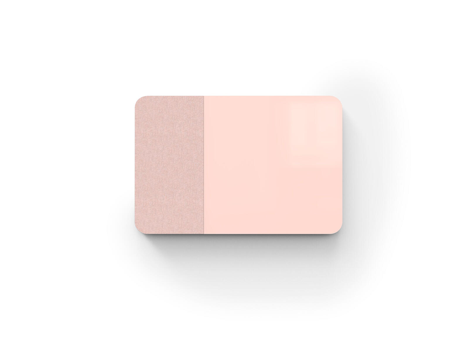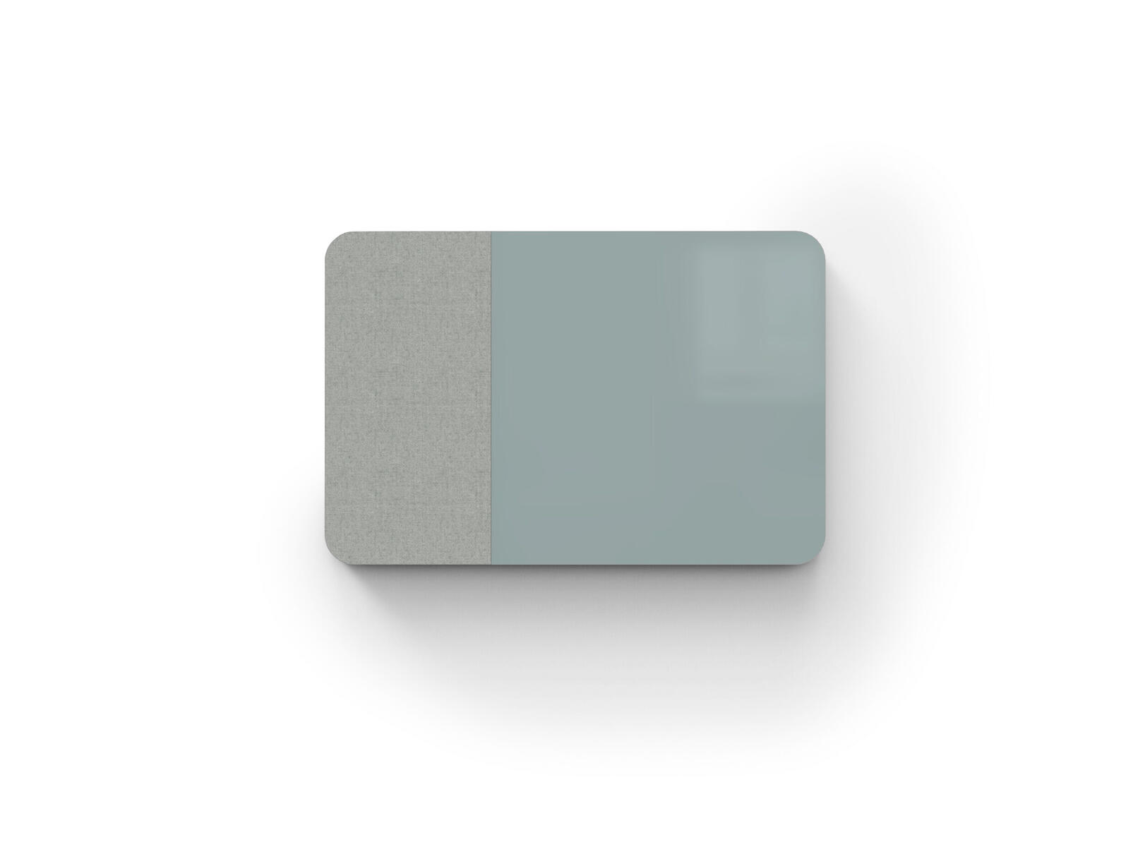 Tavla med kombination av tygklädd yta, skrivbar, magnetisk glasyta samt ljudabsorberande fyllning. Den tygklädda ytan är 50 cm bred. Dolda beslag.