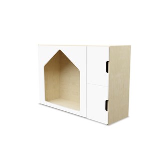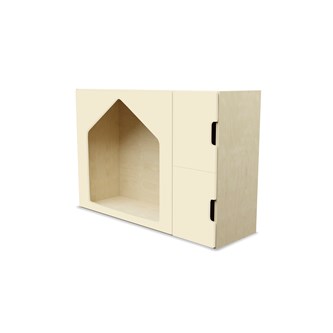 Krypin format som ett hus. Måtten är anpassade för att passa på Fixa 4:1. Björk och vitpigmenterad helt i plywood; färgade med laminat. Ska fästas i vägg med medföljande vinkelbeslag. Kombinera gärna med Fixamadrasser som är speciellt framtagna för husen. För att undvika tipprisk ska fristående moduler ha stödben med 2 låsbara hjul. Moduler utan eller med ben eller sockel ska fästas mot vägg, gäller moduler högre än 80 cm. Monterad.