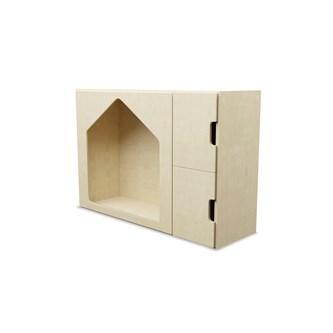Hus i plywood som blir ett eget hus i rummet. Tre hela väggar och ett tak med hål; i hålen passar t.ex. en boll av storlek tennisboll, ärtpåse eller liknande. Hemma Hus stort passar utanpå och litet passar inuti. Man kan sitta i lugn och ro i egna tankar – avskilt men ändå i rummet. Klarlackat. Mått: B87xD87xH100 cm.