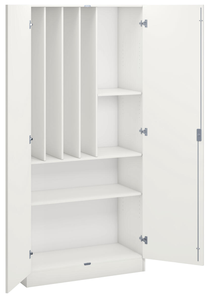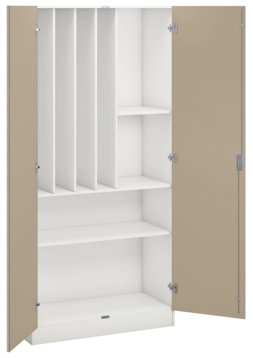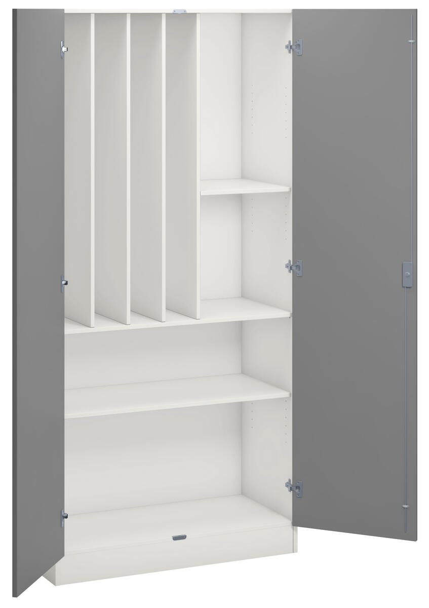 Materialskåp med stomme i direktlaminat. Fronter kan fås med antingen direktlaminat eller högtryckslaminat. Inredd med 5 hyllplan varav 3 flyttbara, 2 hela dörrar med spanjolettlås (inkl. 2 nycklar) och 170 graders öppningsvinkel.