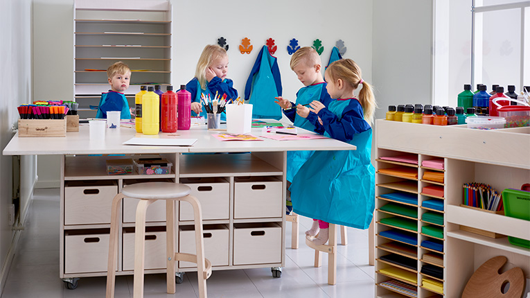 I skaparverkstaden behövs möbler och arbetsytor som klarar många funktioner. Förvaring som gör olika material lättillgängliga är också en förutsättning.