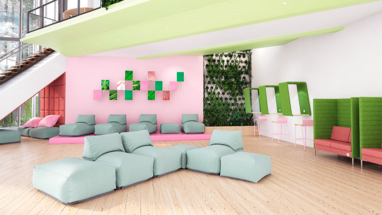 Uppehållsrummet behöver kunna fungera både för den sociala interaktionen som för den som vill sitta enskild men inte avskilt. Viktigt att inte glömma de ljuddämpande inslagen för att hålla en låg ljudnivå.