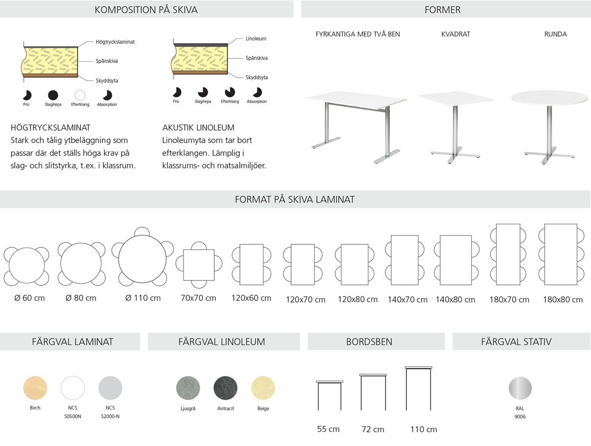 Skiva i tåligt högtryckslaminat. Höjd 72 cm. T-stativ lackerat i silver, RAL 9006.