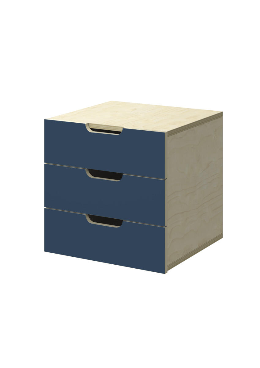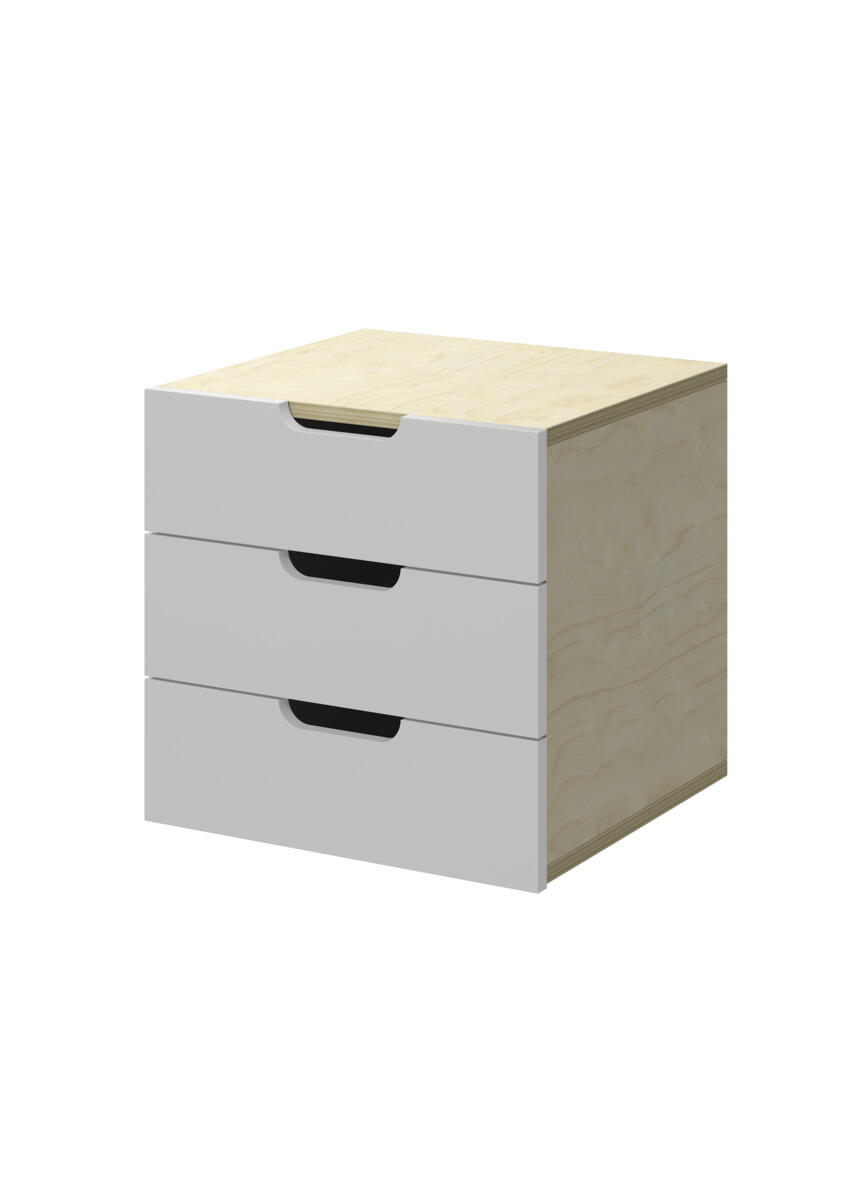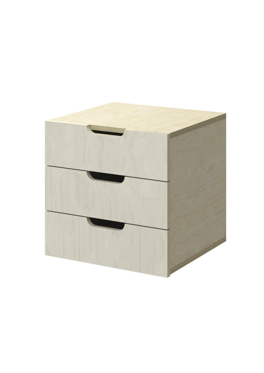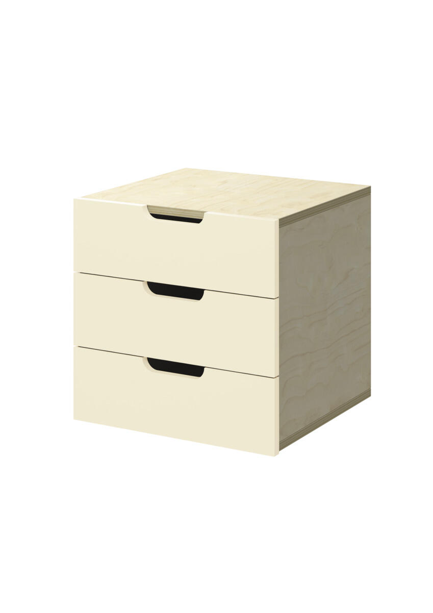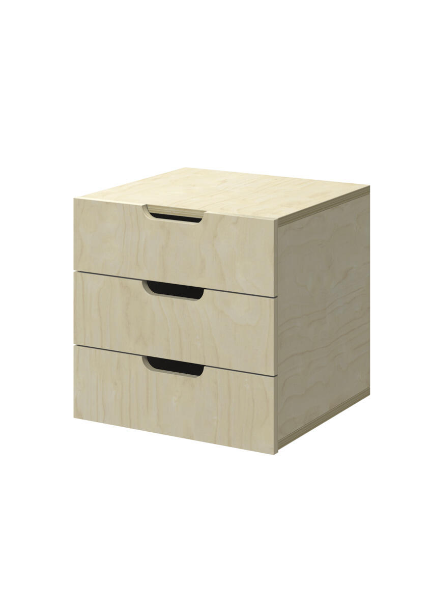 Lådinsats med 3 lådor, passar i ett fack. Handhål som handtag. Lådans storlek 28,5x30x6 cm. Insats 37x36x35 cm. Lådor utan lådstopp. Svanenmärkt, licensnummer 5031 0099.