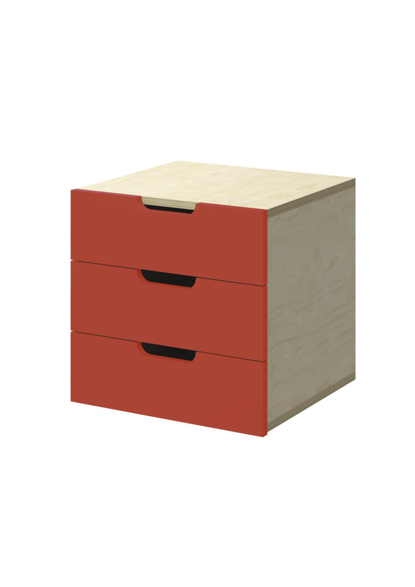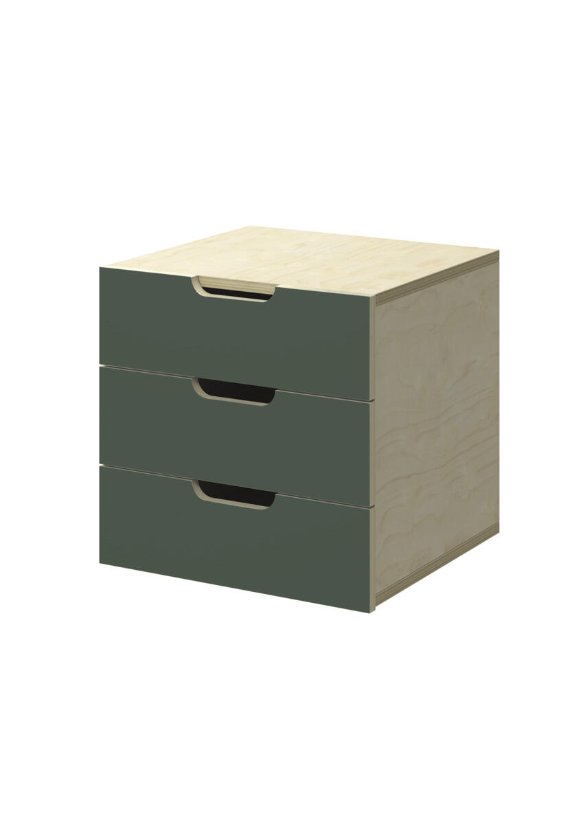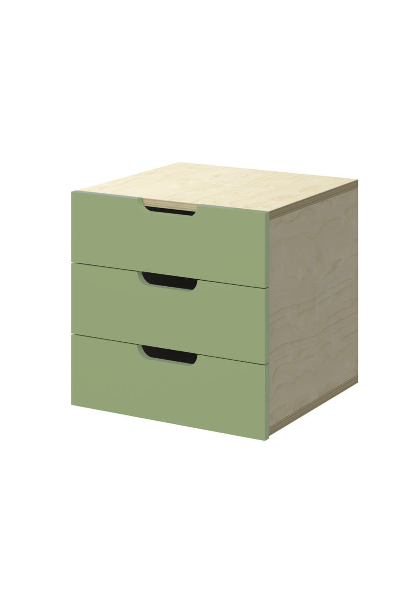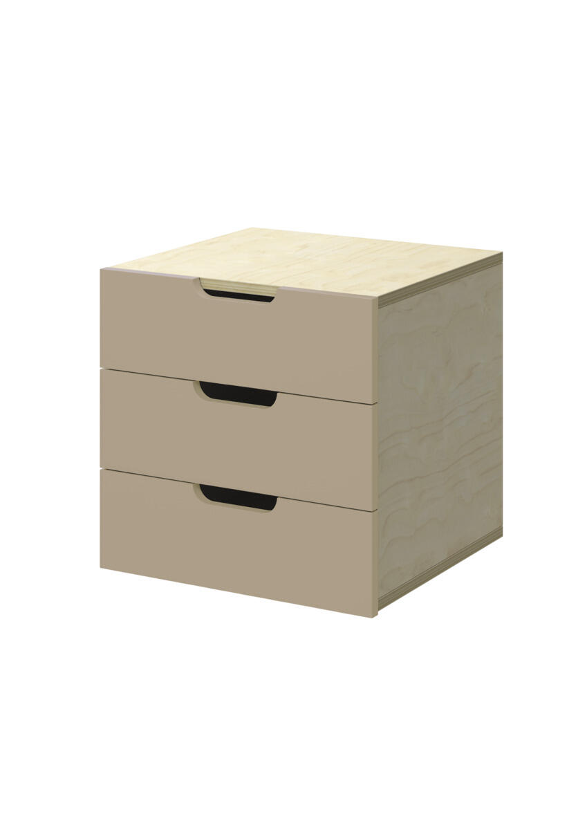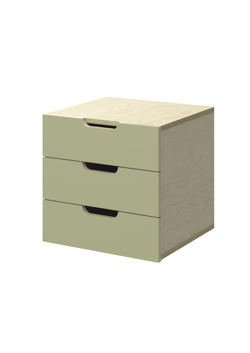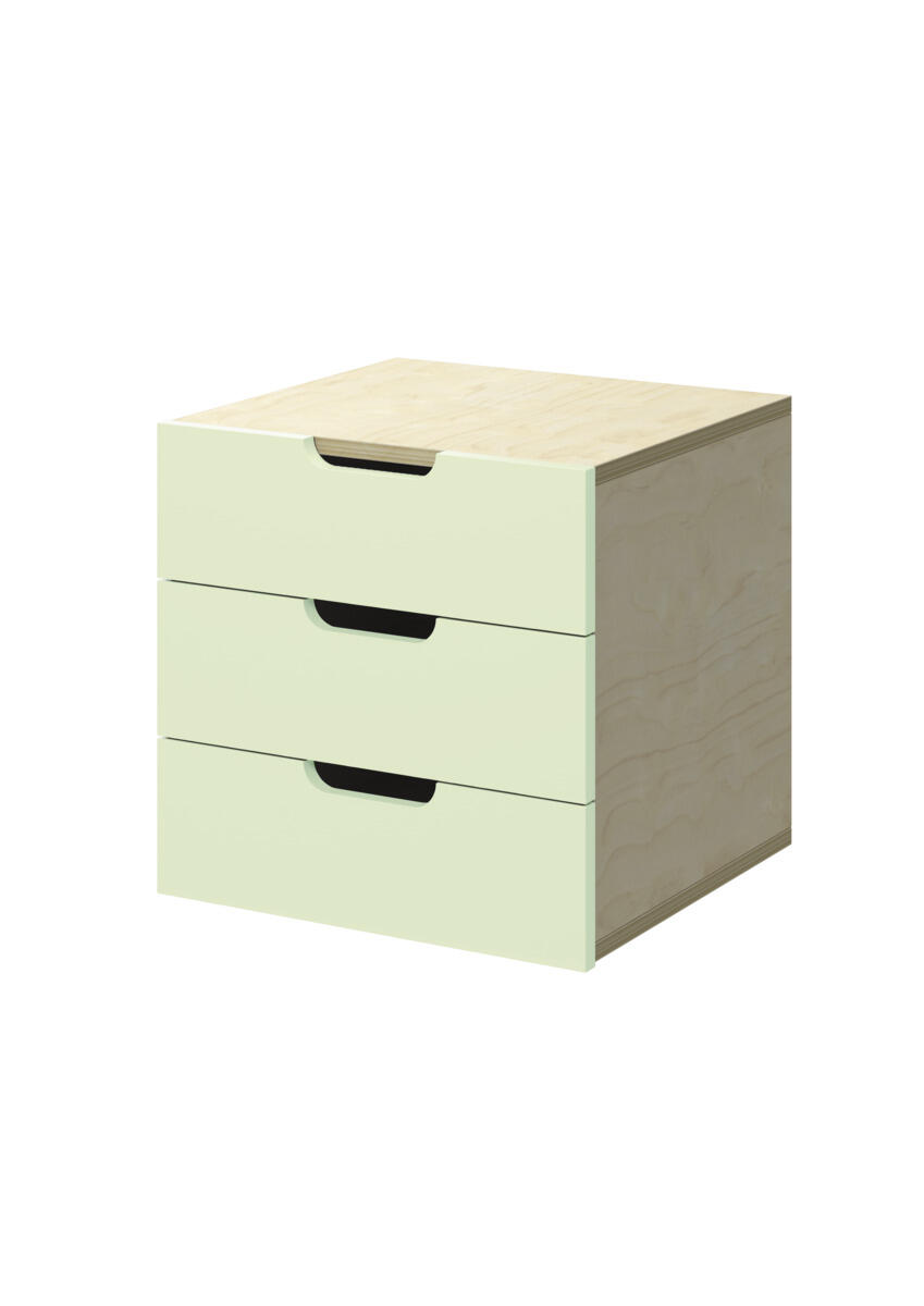Lådinsats med 3 lådor, passar i ett fack. Handhål som handtag. Lådans storlek 28,5x30x6 cm. Insats 37x36x35 cm. Lådor utan lådstopp. Svanenmärkt, licensnummer 5031 0099.