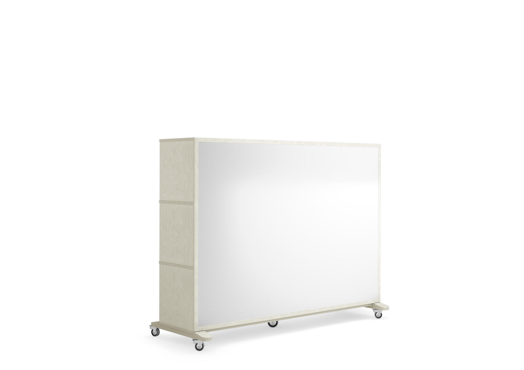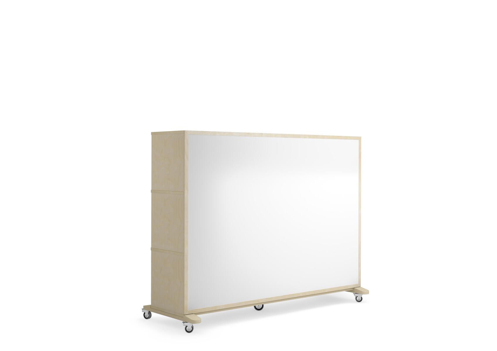 Förvaring med rygg i bulletin board. Tillverkas i björkkryssfaner av högsta kvalitet. 2 fasta hjul på ena kortsidan och 2 rörliga med låsbara hjul på den andra. Förborrade hål för enkel montering av hjul. Mobila enheter ger en ökad flexibilitet och möjlighet att enkelt förändra rummets möblering. Undvik att placera tunga föremål högt upp i hyllan. Minska tipprisk genom att rikta hjulen framåt respektive bakåt samt lås hjulen. Val av färg är högtryckslaminat på förvaringens topp. Vid val av vitpigmenterad är förvaringen helt i plywood.