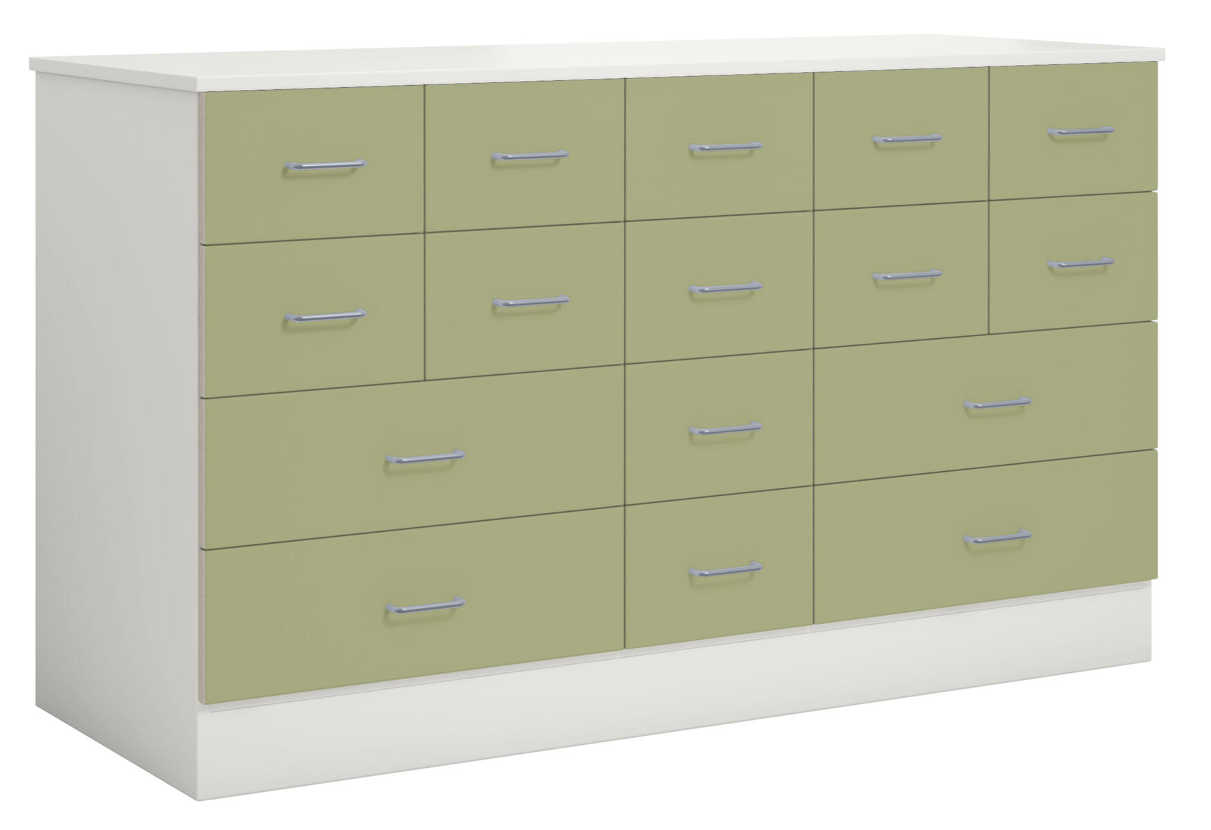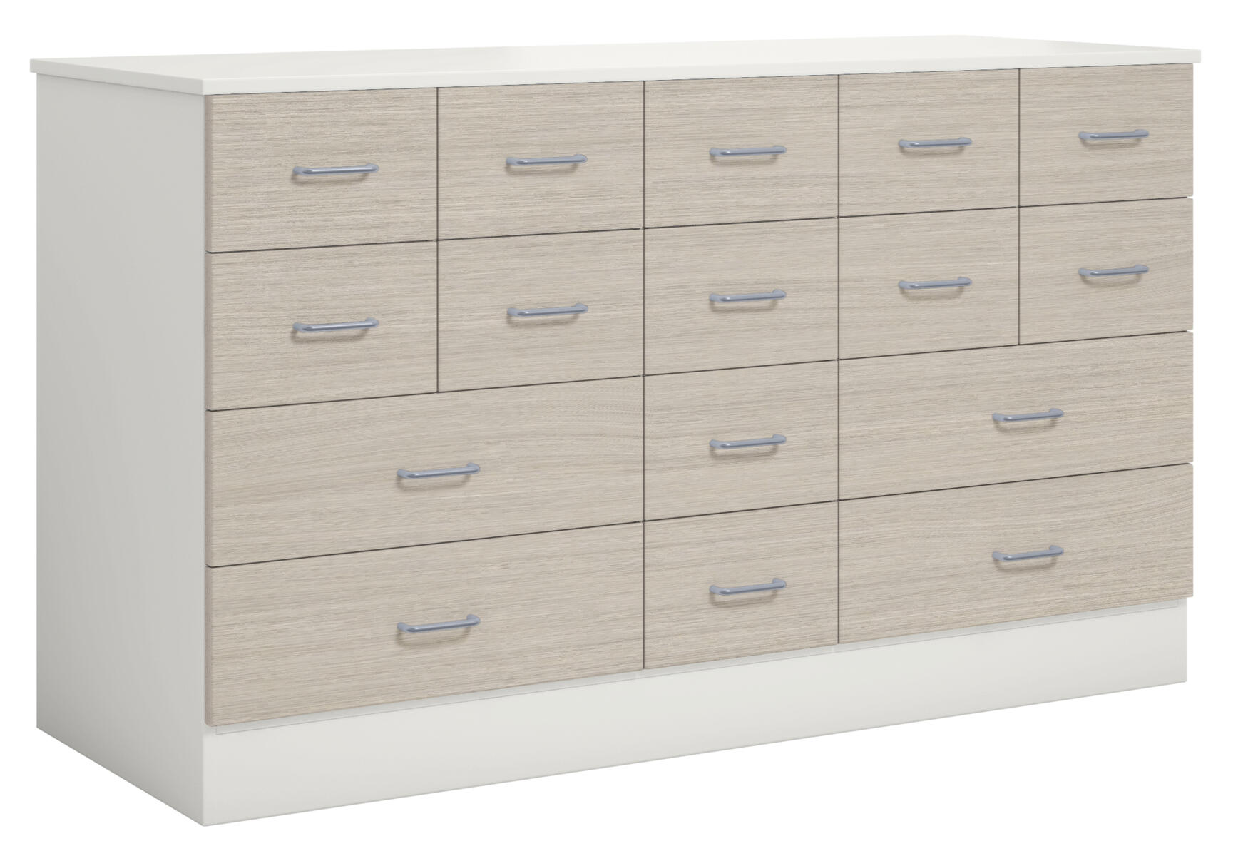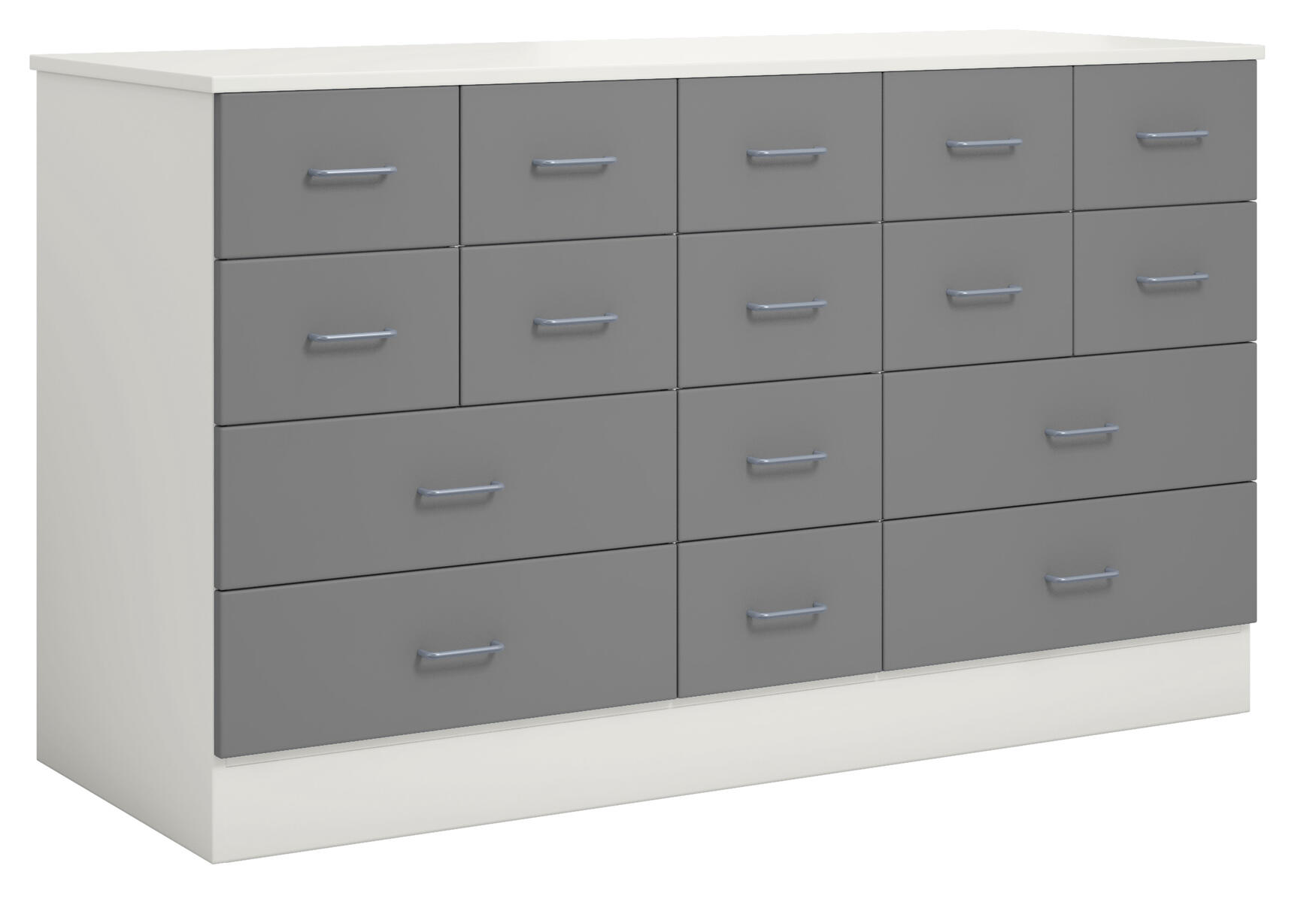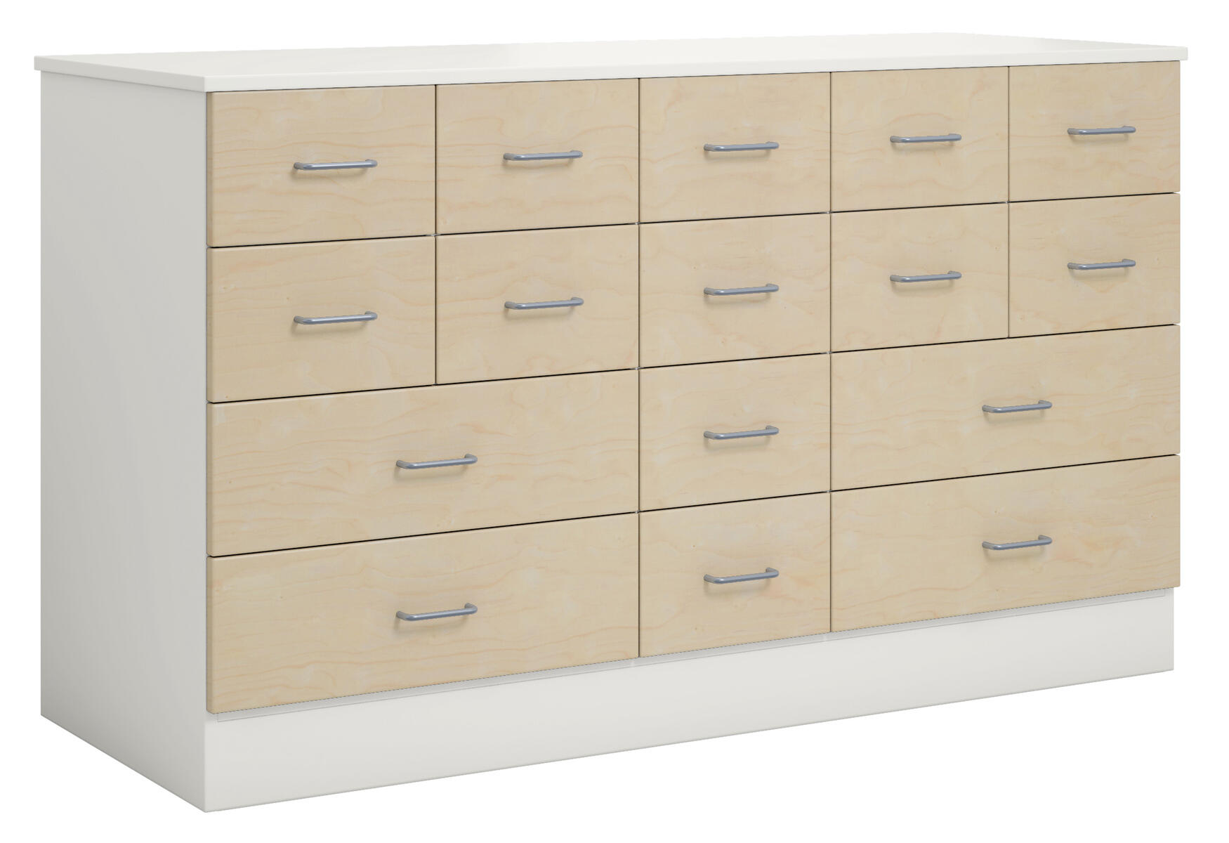 Materialskåp med stomme i direktlaminat. Fronter kan fås med antingen direktlaminat eller högtryckslaminat. Inredd med 3 hyllplan och 12 lådor, 2 hela dörrar med spanjolettlås (inkl. 2 nycklar), 170 graders öppningsvinkel. Högtryckslaminat på fronten gör att den får en extremt tålig yta.