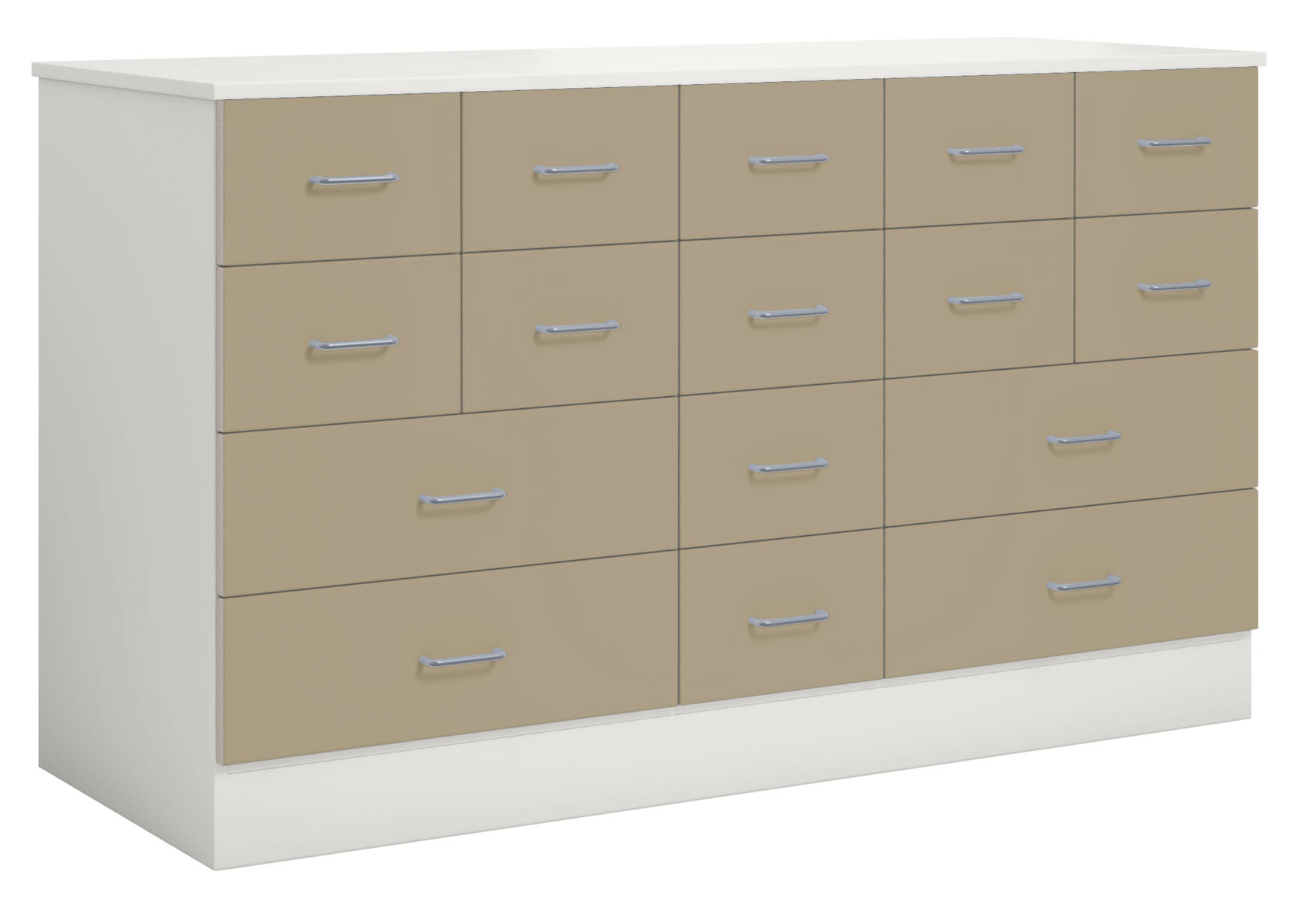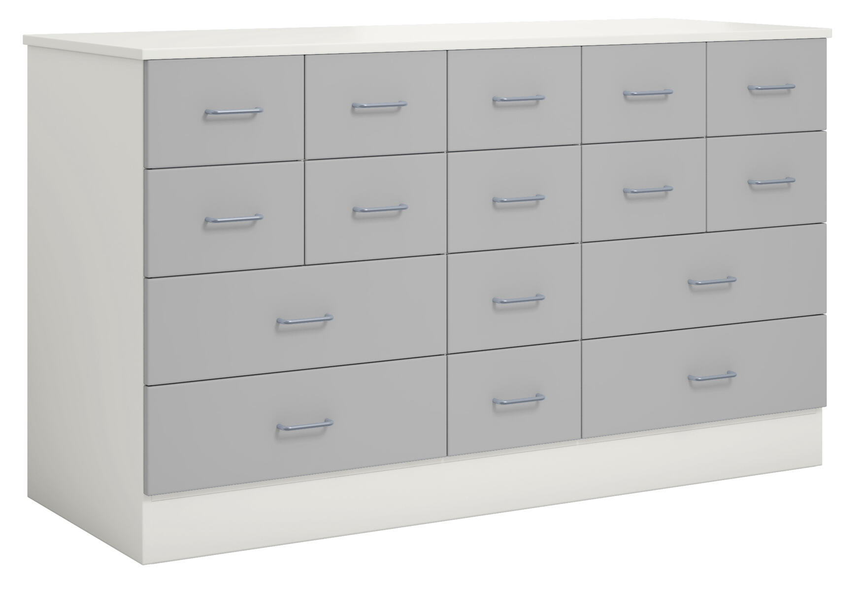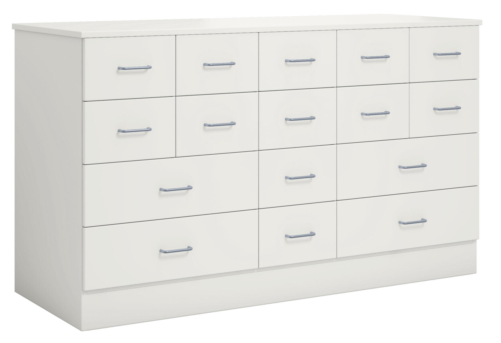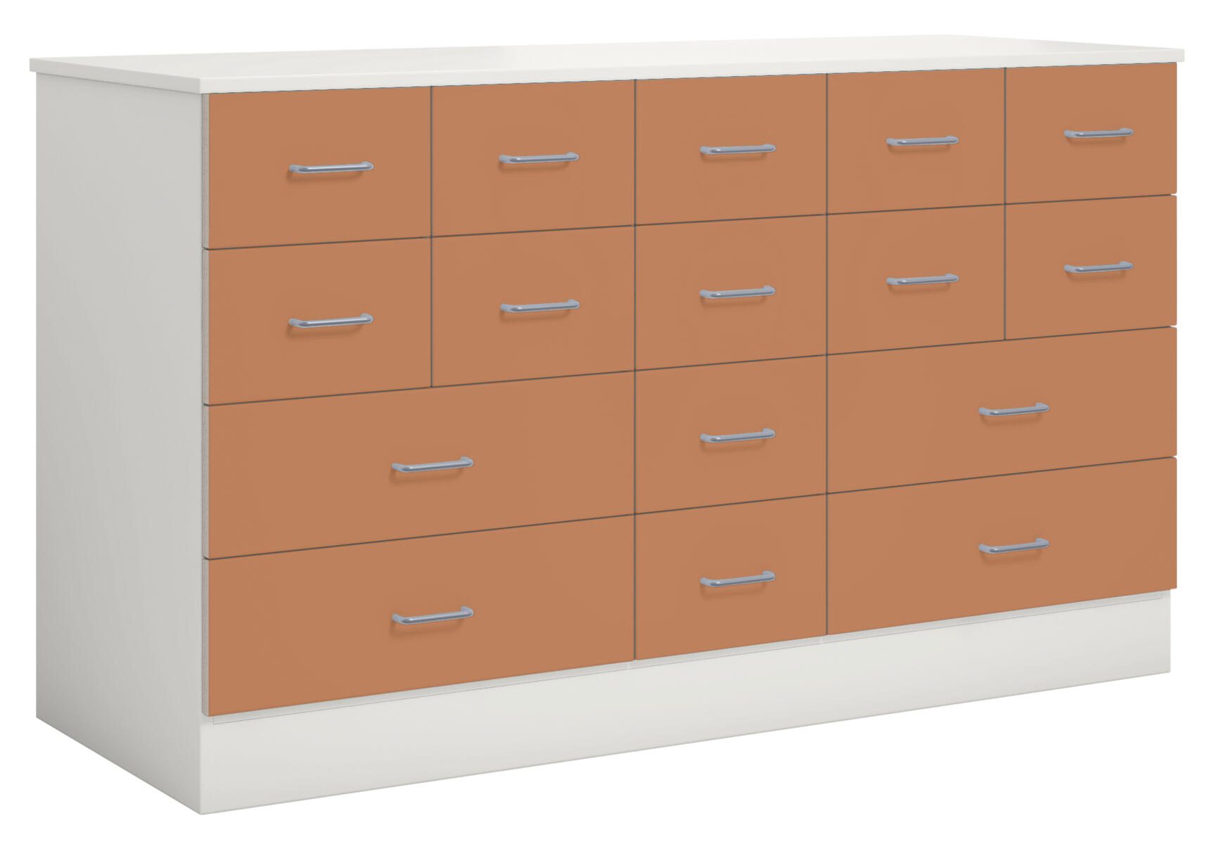 Köpmansdisk med 16 lådor, 12 små lådor och 4 stora lådor. Stomme i direktlaminat. Lådfronter kan fås i direktlaminat eller högtryckslaminat. På sockel, lådor kompletta med handtag.