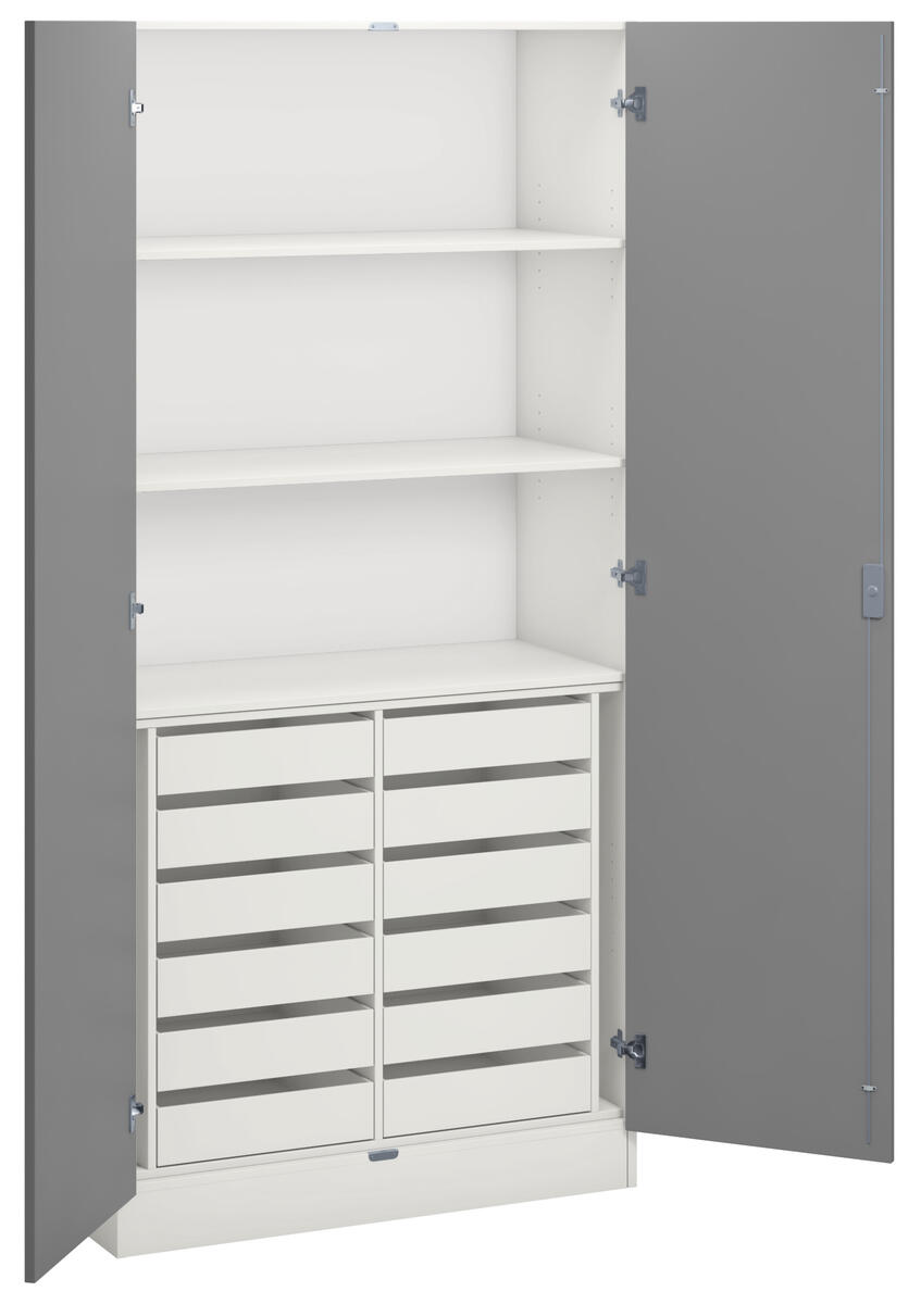 Materialskåp med stomme i direktlaminat. Fronter kan fås med antingen direktlaminat eller högtryckslaminat. Inredd med 3 hyllplan och 12 lådor, hela dörrar med spanjolettlås (inkl. 2 nycklar) och 170 graders öppningsvinkel. Högtryckslaminat på fronten gör att den får en extremt tålig yta. Lådornas innermått: B34xD39xH4 cm.