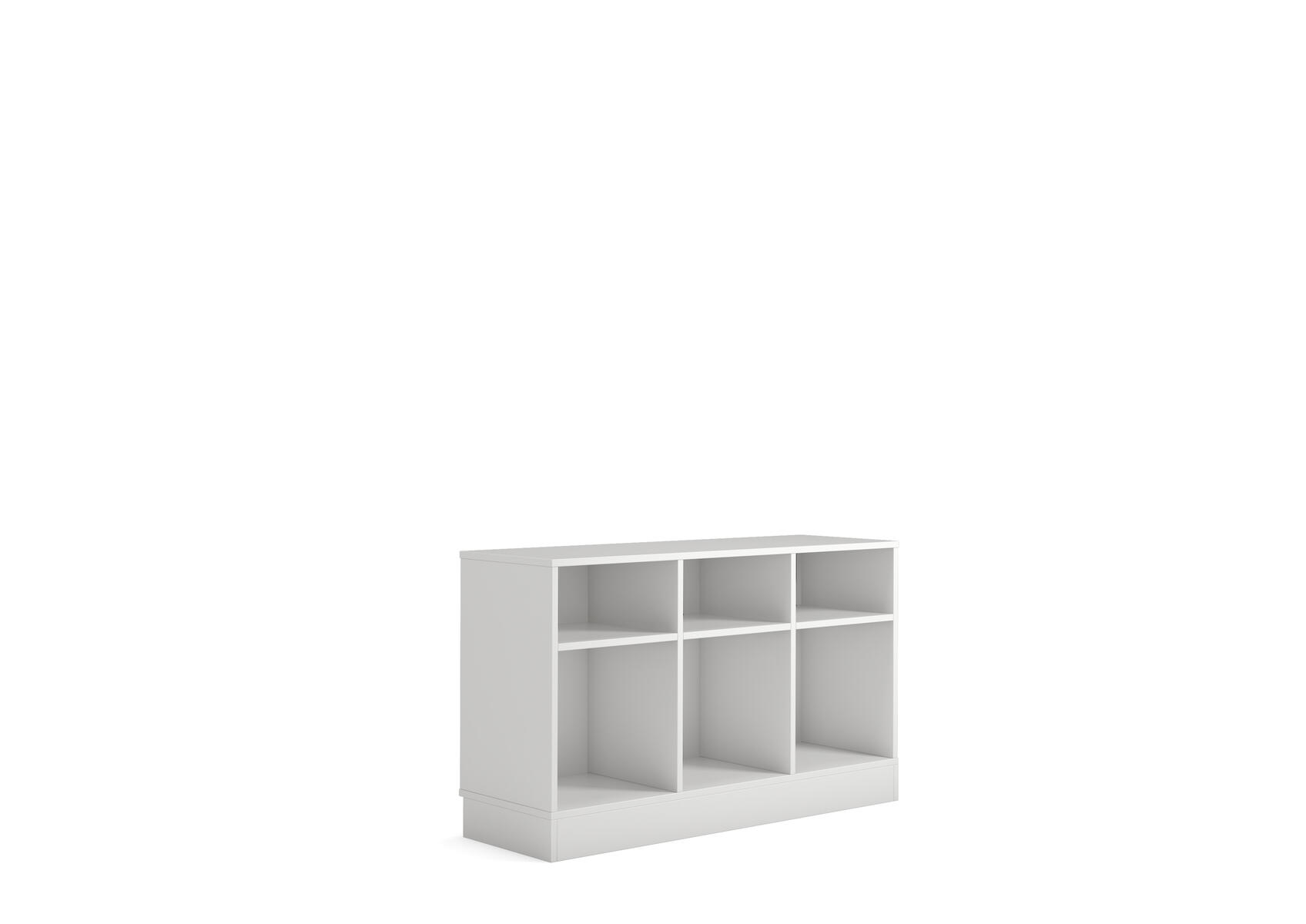 Beställ alltid via säljare för att säkerställa ritning. Elevförvaring som byggs efter eget önskemål och levereras färdigmonterad. Stommar har förborrade hål i sidopaneler/skiljeväggar för att kunna erbjuda alla tänkbara kombinationer. Denna stomme har sex öppna hyllor, med bottenplatta som är något bredare för ökad stabilitet. 6 hjul varav två är rörliga och med lås på ena kortsidan. De två i mitten är också rörliga. Den andra kortsidan har två är fasta, vilket gör förvaringen stabil vid förflyttning. Lägg till dörrar eller lådor enligt önskemål och levereras färdigmonterad. Elevförvaringen kan också användas helt öppen. Lådor och dörrar har en smal öppning som agerar postfack och öppnare. Material 18 mm spånskiva med laminat. Kantband i ABS. Stomme med ben och sockel ska fästas i vägg med medföljande väggbeslag. Skruv för detta ingår inte. Ben, sockel och hjul bygger 10 cm i höjd. Innermått fack: B38xD38xH38 cm. Bottenplatta D44,5 cm.