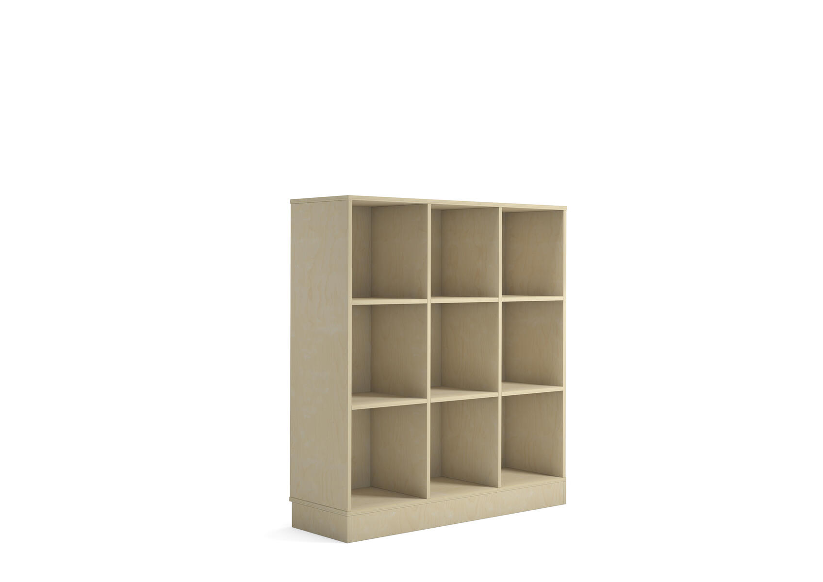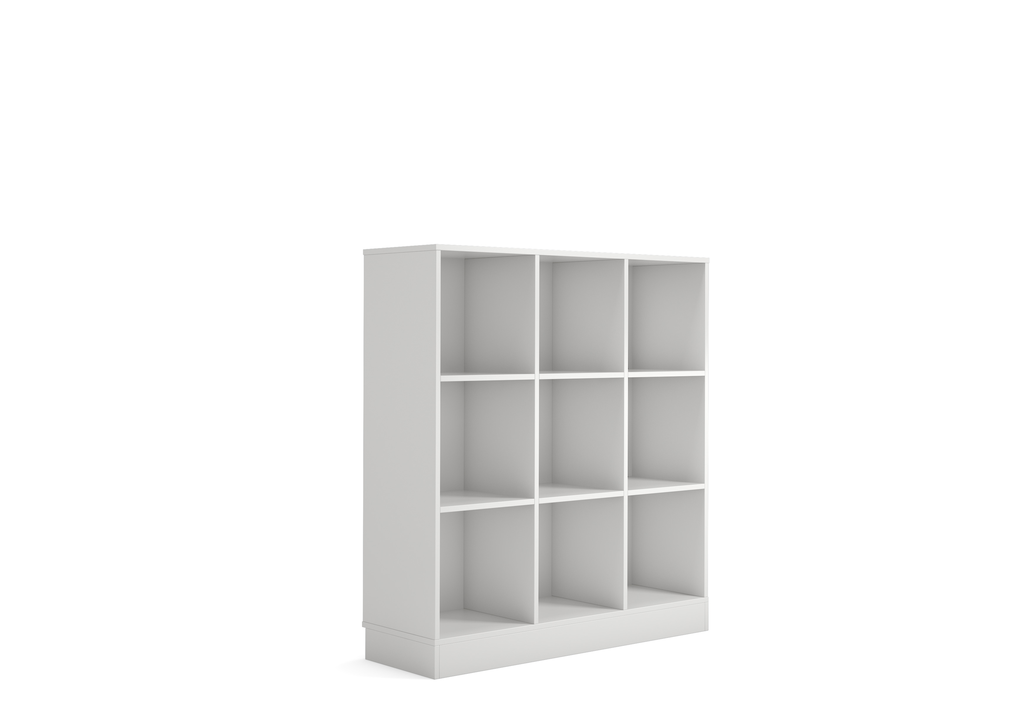Beställ alltid via säljare för att säkerställa ritning. Elevförvaring som byggs efter eget önskemål och levereras färdigmonterad. Stommar har förborrade hål i sidopaneler/skiljeväggar för att kunna erbjuda alla tänkbara kombinationer. Denna stomme med sockel har nio öppna hyllor. Lägg till dörrar eller lådor enligt önskemål och levereras färdigmonterad. Elevförvaringen kan också användas helt öppen. Lådor och dörrar har en smal öppning som agerar postfack och öppnare. Material 18 mm spånskiva med laminat. Kantband i ABS. Stomme med ben och sockel ska fästas i vägg med medföljande väggbeslag. Skruv för detta ingår inte. Ben, sockel och hjul bygger 10 cm i höjd. Innermått fack: B38xD38xH38 cm.
