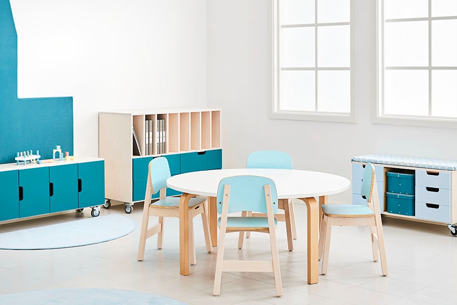 Färgkoordinerad med vårt övriga sortiment. Stativet är i vitpigmenterad björk och sits och rygg är i tåligt högtryckslaminat. Stolen är även försedd med tysta glidtassar för en lugnare miljö. Använd gärna vårt upphängningsbeslag för att underlätta städning. Sits: B34 D28 cm.