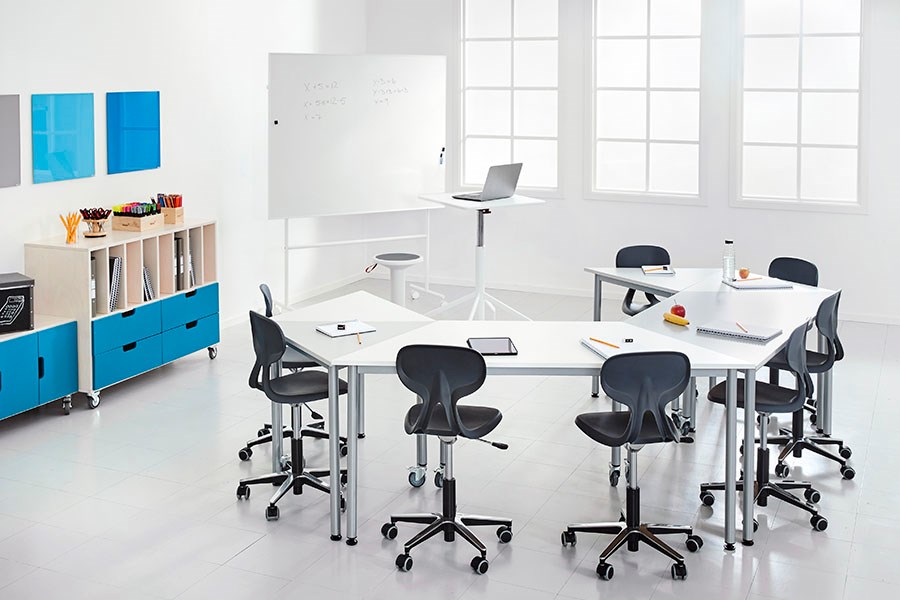 Det ergonomiska utförandet hjälper användaren till en bättre hållning och ger ett flexibelt stöd för ryggen. Stapelbar med max 4 stolar och upphängningsbar när man vänder den. Lätt att rengöra. Skal i polyuretan. Silverlackerat stativ RAL 9006. Mått: Sitthöjd 50 cm. Sitsbredd 44 cm. Sitsdjup 40 cm. Inklusive justerbart fotstöd.