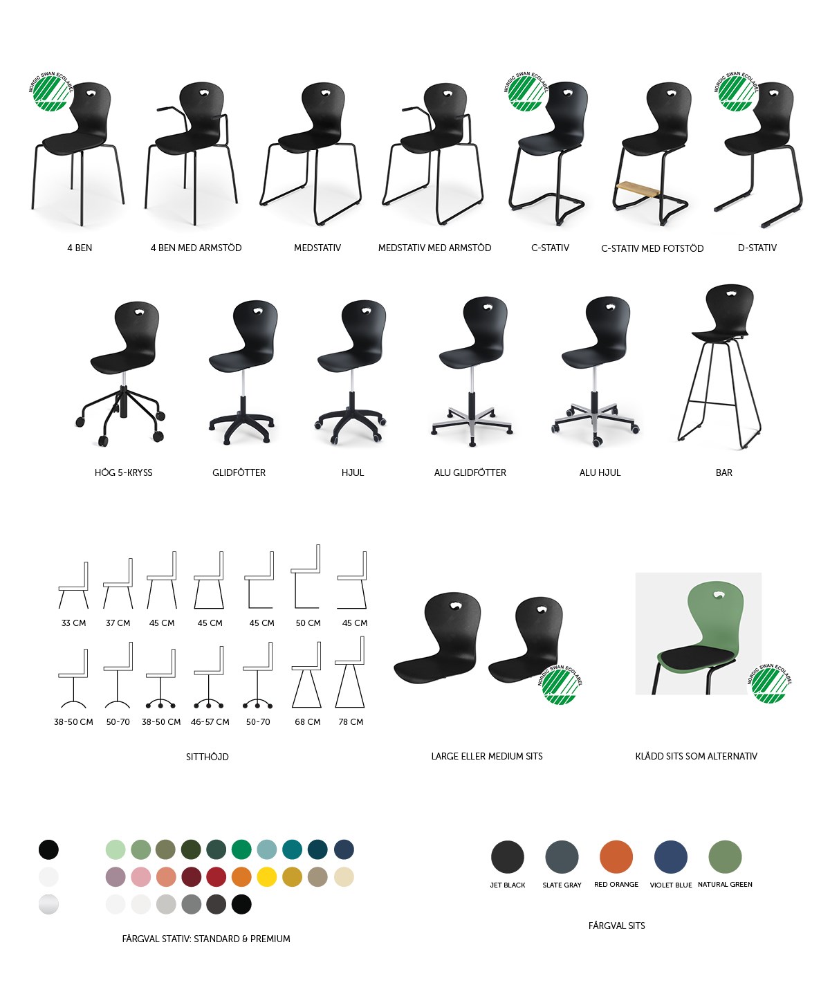 Plastskal av 100 % återvunnet material. Stolen uppfyller EN 1729-1 Sixemark 5&6, vilket innebär att användare mellan 146 och 188 cm sitter bekvämt och ergonomiskt riktigt. Väskkrok på baksidan. Lätt att rengöra. Silverlackerat stativ RAL 9006. Mått: Sitthöjd 45 cm. Sitsbredd 42 cm. Sitsdjup 40 cm. Välj till klädd sits i 100 % återvunnet material.