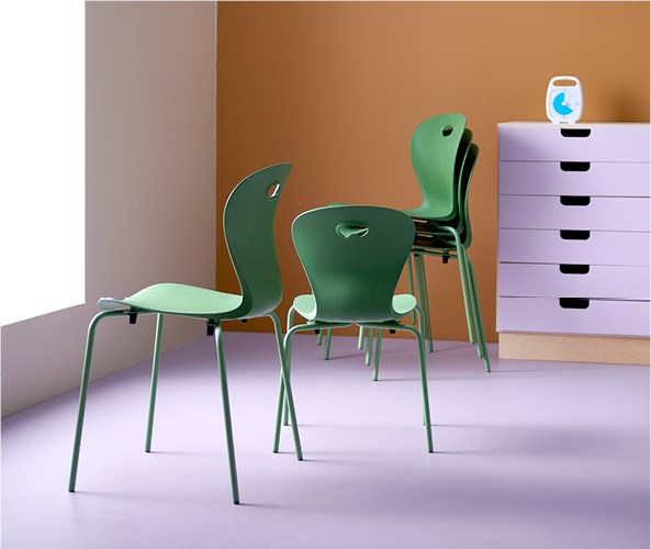 Plastskal av 100 % återvunnet material. Stolen uppfyller EN 1729-1&2 Sizemark 4-5, vilket innebär att användare mellan 133 och 176 cm sitter bekvämt och ergonomiskt riktigt. Väskkrok på baksidan. Stapelbar med max 4 stolar och upphängningsbar när man vänder den. Lätt att rengöra. Silverlackerat stativ RAL 9006.